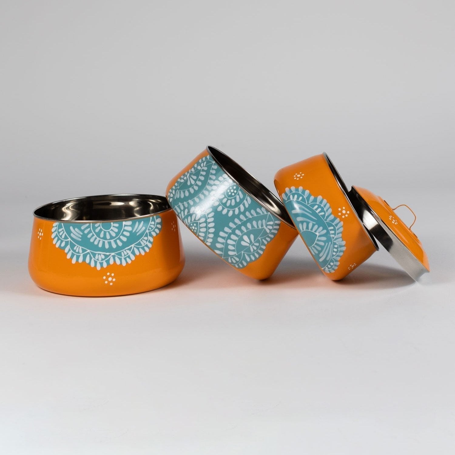 Going plastic-free at lunchtime is as easy as 1-2-3 with this 3 Tier Steel Tiffin To Go Container. Featuring 3 different stainless steel containers with lids that stack and connect, your lunch will stay put and you'll never buy another single-use plastic baggie again. This handcrafted container system is powder coated in orange with a handpainted blue and white design so your lunch is as stylish as it is eco-friendly. Bonus: the larger two lids can act as plates when mealtime arrives.