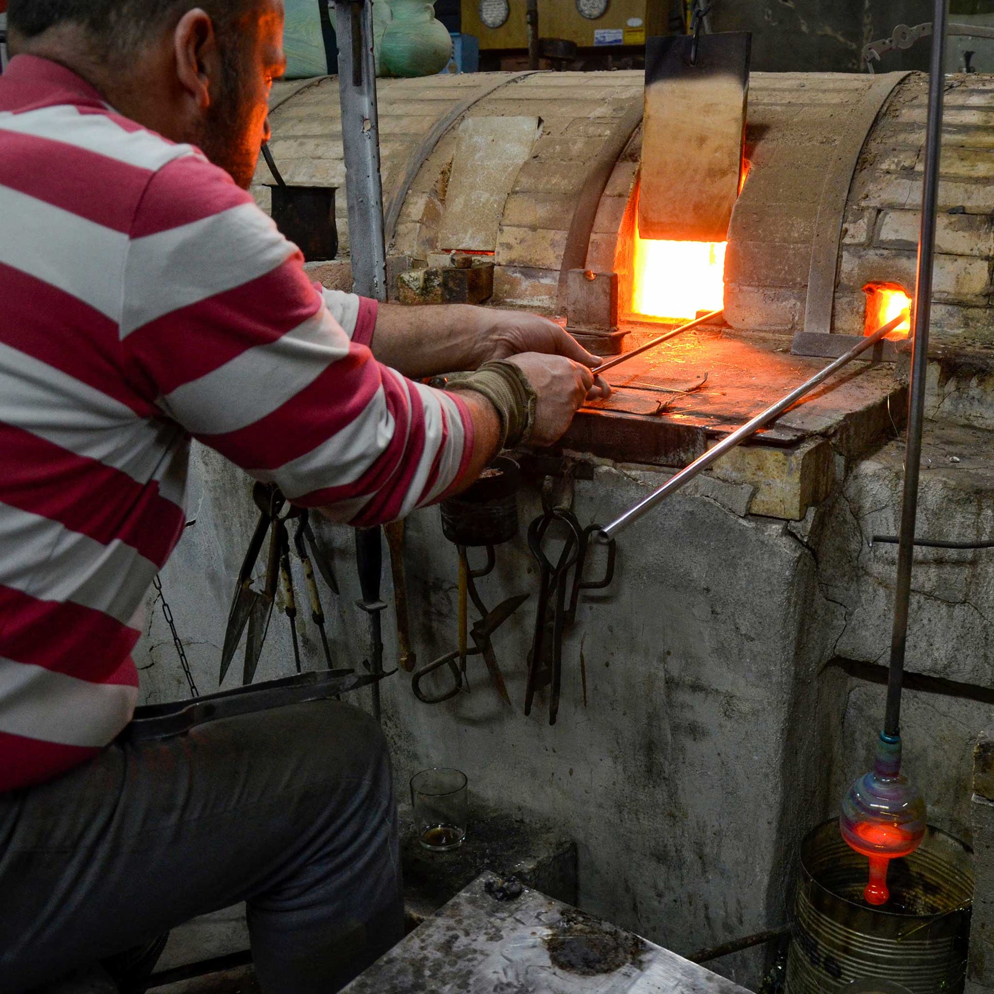 Shadowy blues, purples and blacks swirl around this handsome little vase. Recycled bottles are smashed into pieces and melted in high temperature ovens. In Phoenician glass blowing, artisans add substances to the molten glass, creating a range of colors within each piece. Working with this process takes an especially skilled hand, and is reserved for the true masters of the art. Each piece has its own unique blend of color and pattern.