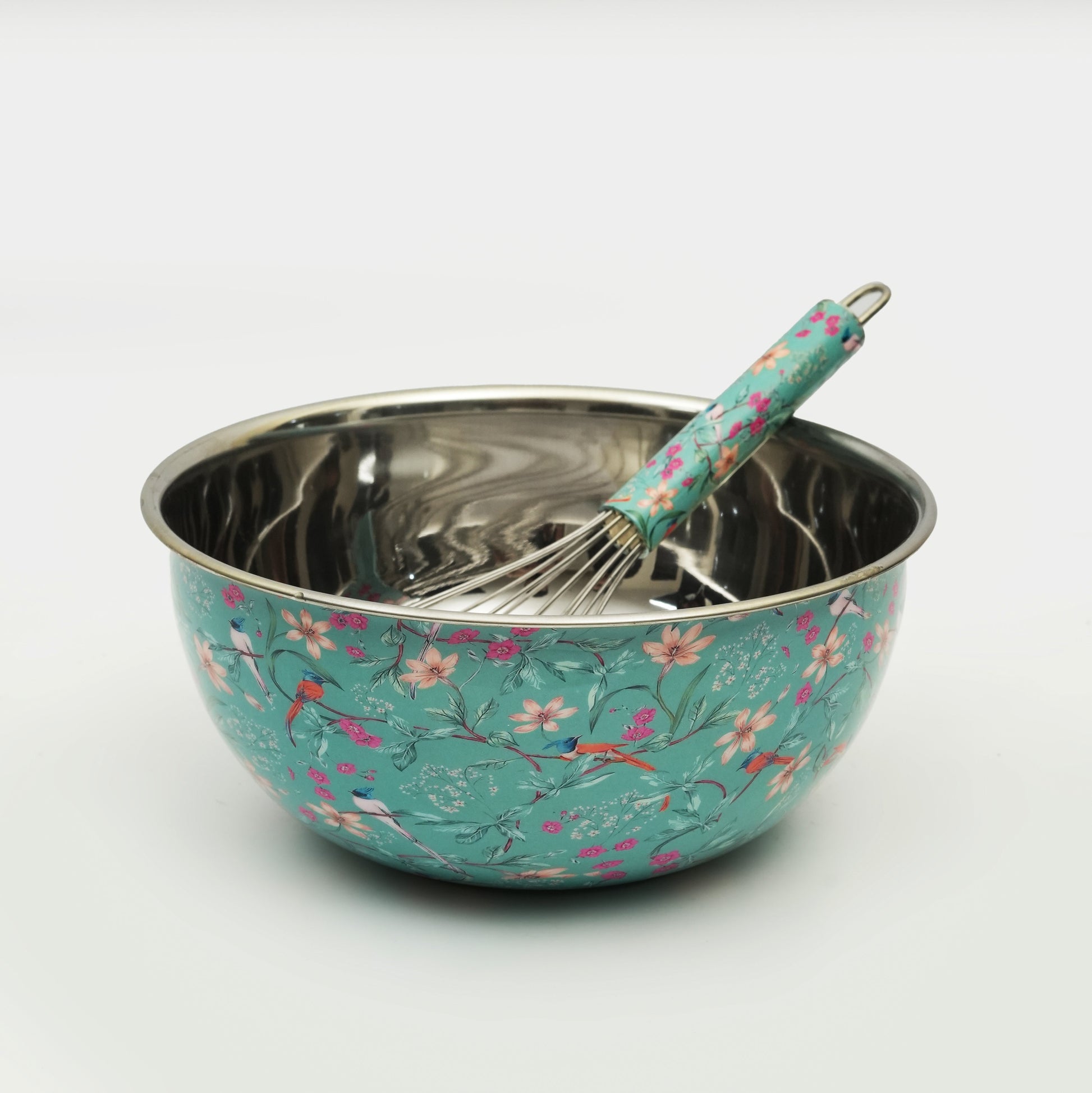 Infuse your kitchen with the vibrant charm of the Aqua Flora Bowl & Whisk Set. Featuring a botanical-inspired enamel print in aqua, green, and multicolor tones, this 8.5" stainless steel bowl brings a refreshing burst of color to everyday tasks. Paired with a sleek 10" whisk, the set is perfect for mixing, serving, or simply displaying as a decorative accent. Lightweight, rust-resistant, and easy to clean, it’s as functional as it is beautiful—ideal for modern, eclectic, or nature-inspired homes. A thoughtful gift for bakers and hosts who love utility with a touch of artistry.