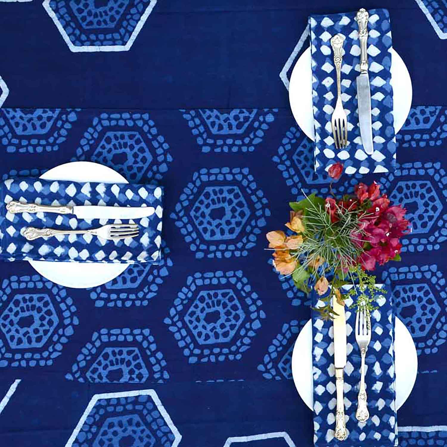Handcrafted with intention, the Karma Napkins are block printed by hand on hand-spun and handwoven organic cotton. Each piece carries soft indigo tones created from natural dyes, giving it a calming and timeless appeal. Perfect for adding a serene touch to your table, these napkins are versatile enough for daily meals, gatherings, or thoughtful gifting—a simple way to bring mindfulness and beauty to your home. • hand-block printed using a wooden carved block • hand dyed in Natural Dyes • color - indigo blue • fabric - organic cotton • size - 19" x 19" • includes: set of 4 *Please note that slight color variations may occur, as each piece absorbs natural dyes differently—a beautiful part of the handmade process. --------------------------------------- ABOUT BLOCK PRINTING Block Printing is an ancient printing technique especially with the use of vegetable dyes. After the wooden block is carved with the pattern, the fabric is then prepared with multiple washes to make the fiber ready to take the dye. With the process of multiple printings and washing before the final product is placed in a dye bath of flowers and barks, the fabric goes through the hands of the block printer and dyer with utmost care. That same care is passed onto the consumer who wishes to take part in this process of honoring the craft and the earth that gives us so much.