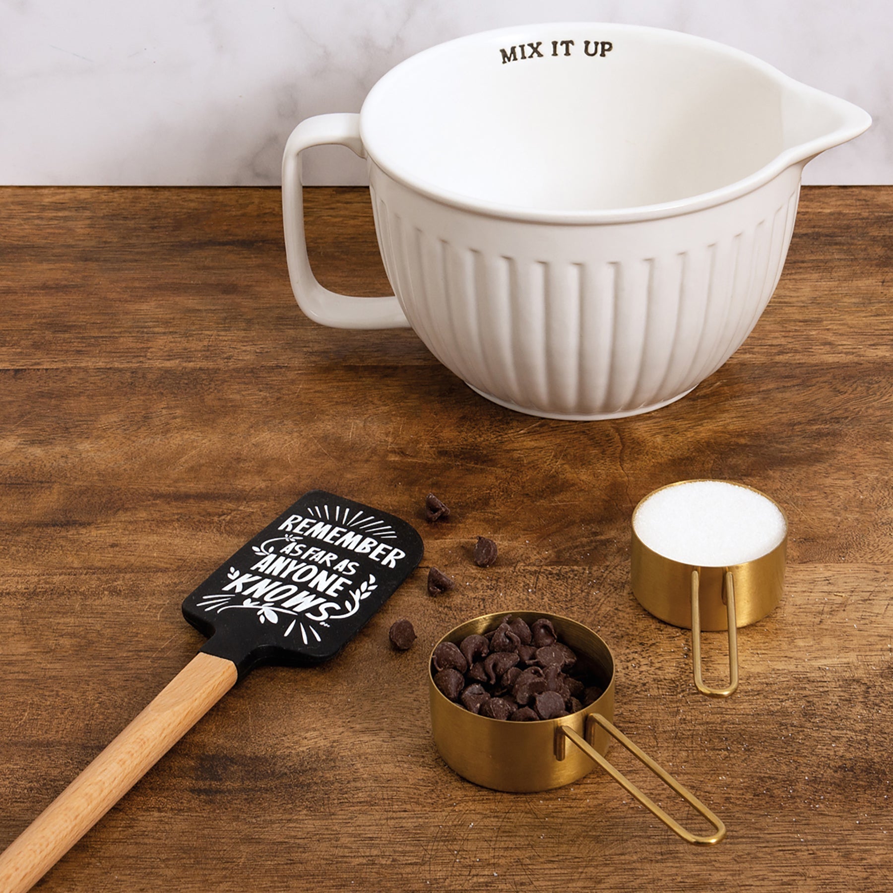 This cute and funny spatula features a logo engraved into wooden handle for added interest and a decorative bow and ribbon for hanging.