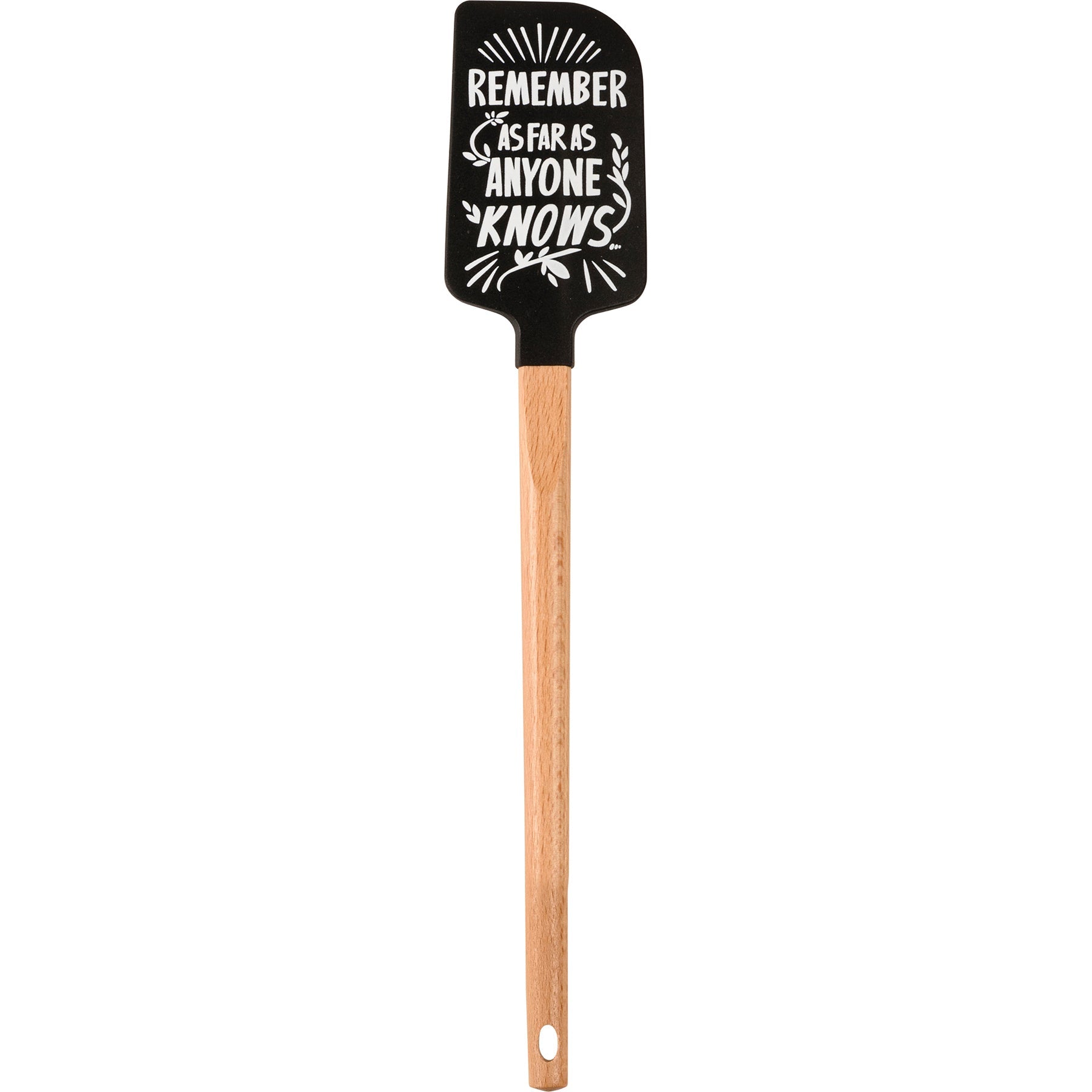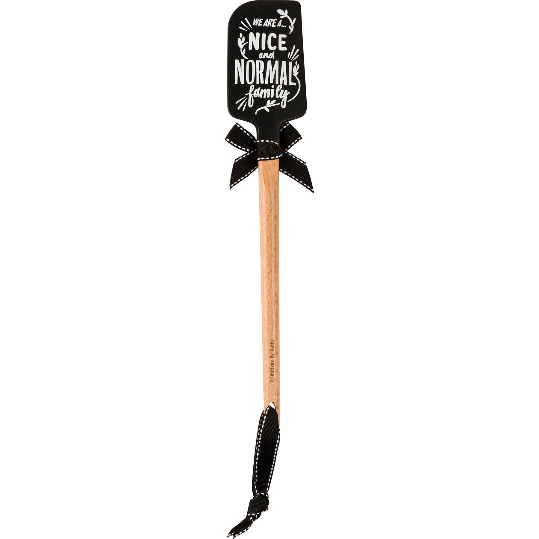 A double-sided silicone spatula featuring branch designs with "Remember As Far As Anyone Knows" on one side and "We Are A Nice And Normal Family" on the other side. Some cute little branch designs set off the sentiment.
