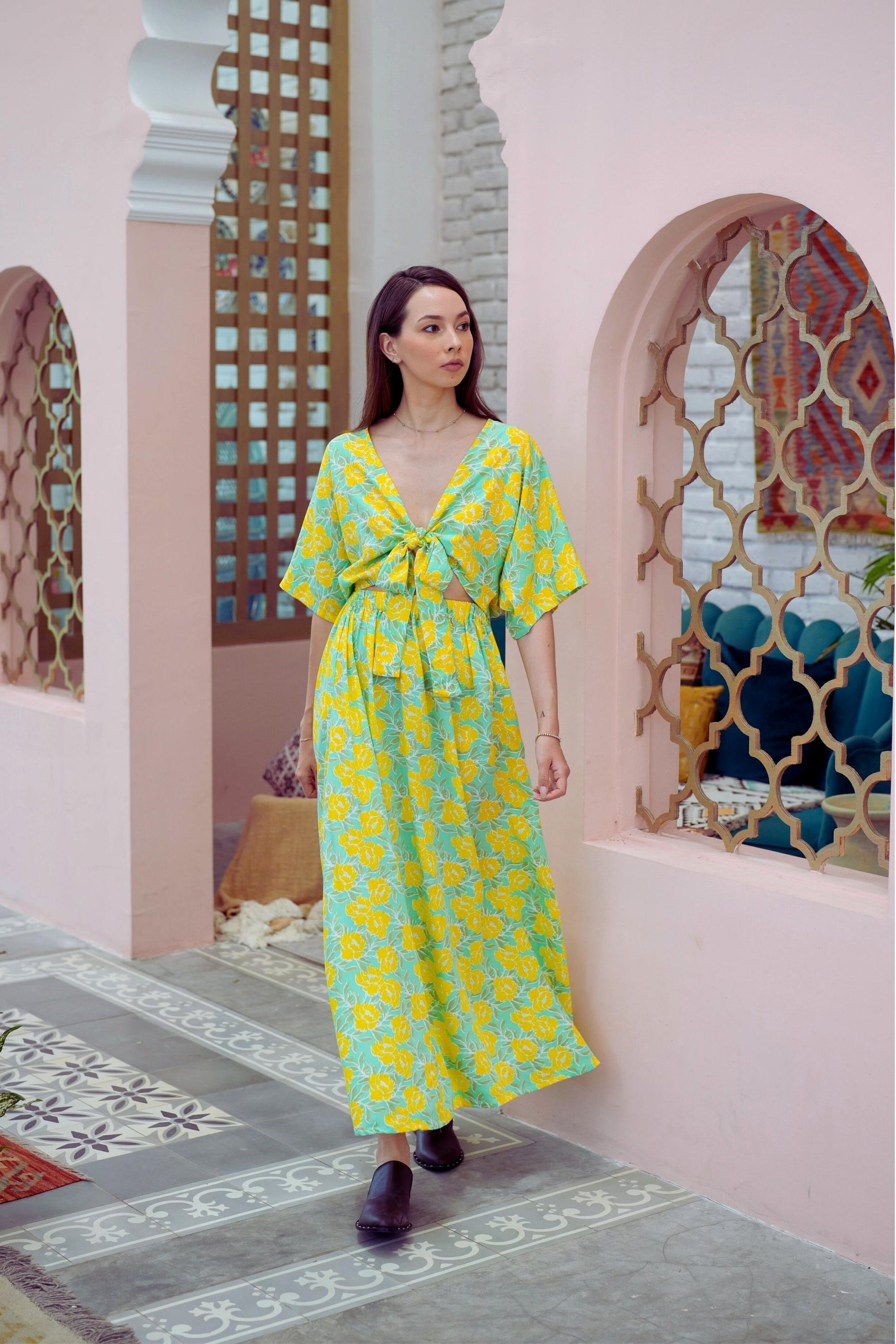 Aubrey Floral Wrap Top and Midi Skirt Matching Set in Yellow Garden