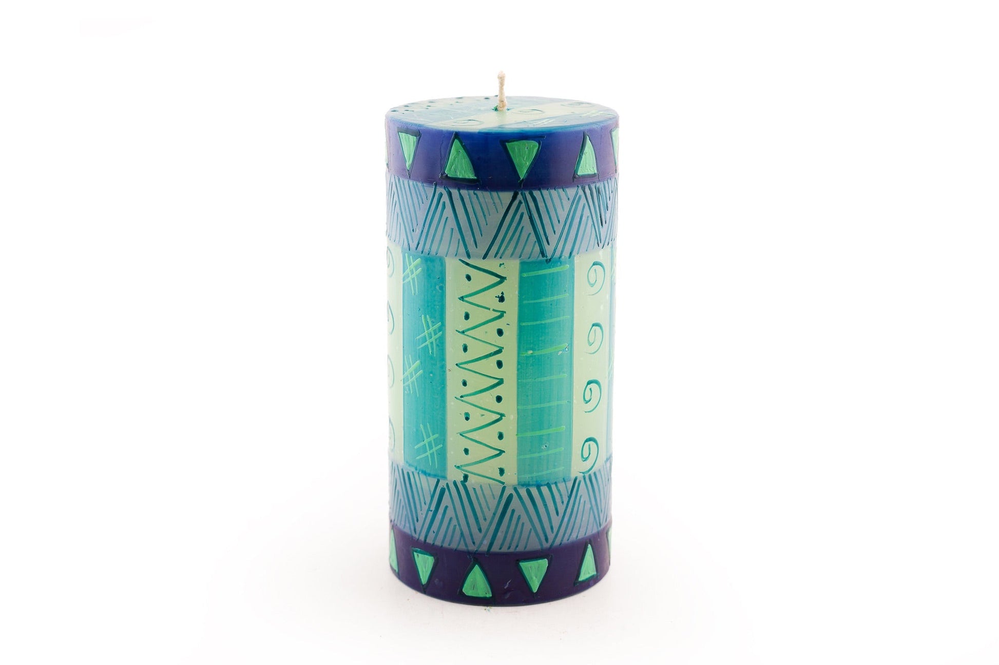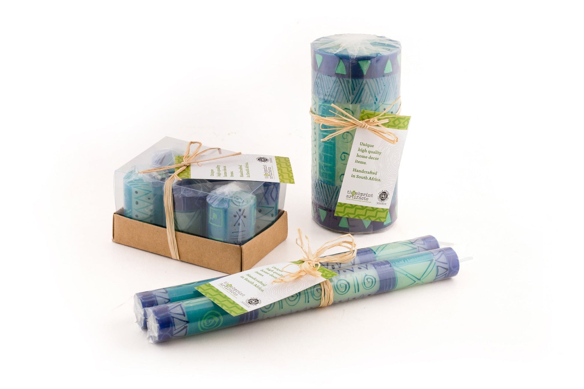 The Blue & Green candle collection is a classic way to brighten any home! *Lovingly hand poured and hand painted in South Africa. *Crafted primarily by single mothers from the local rural community. *On average, each artisan supports an extended family of 12-15 people. PRODUCT DESCRIPTION: *Highest quality natural paraffin wax with 100% cotton wick *Unscented, smokeless, and free from added toxins *Tapers packaged as a matched pair *Each candle is uniquely made. Your delivered candle will likely appear slightly different from the website photo, but consistent with the theme of the collection. CANDLE CARE: *First burn time: 1-hour for every inch diameter *Wicks should always be cut to ¼” prior to lighting *Avoid drafts – they cause dripping! *Ensure candles are extinguished prior to leaving the room Learn more about the artisan hands that make these products!
