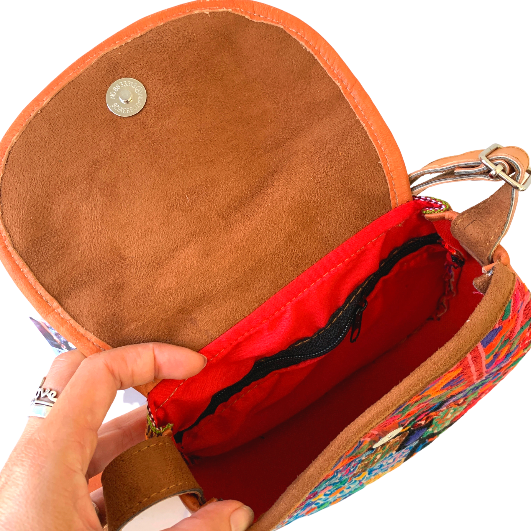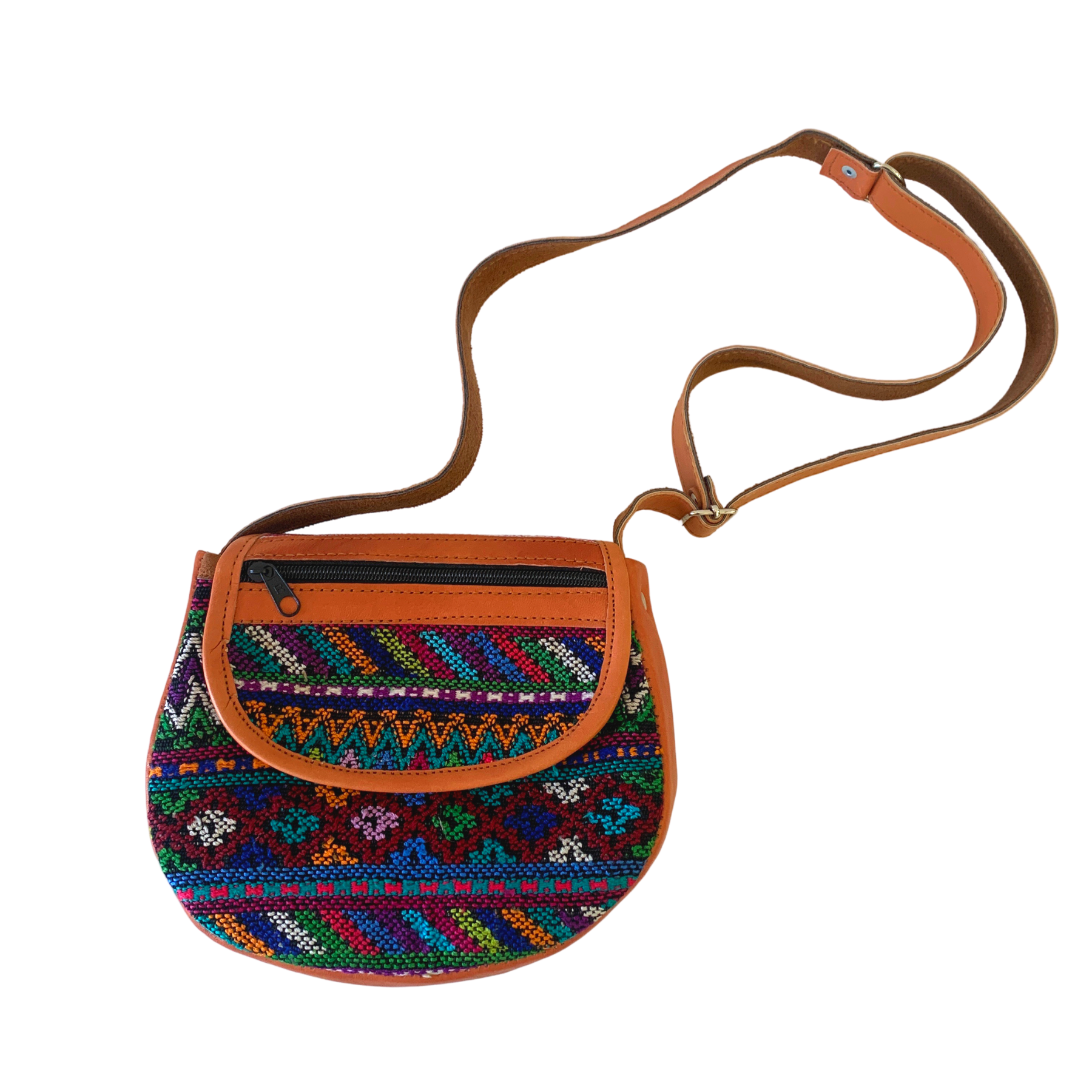 Purse Camila has a front panel that is made from an upcycled Huipil blouse. The back panel is brightly striped hand loomed fabric from Guatemala. The back panel has an outside zip pocket that is accented with leather. A strip of leather creates the base and sides of Camila. Magnetic closure and fully lined with nylon fabric. There is one inside zip pocket. The leather strap is fully adjustable. Handmade in Guatemala by women artisans.