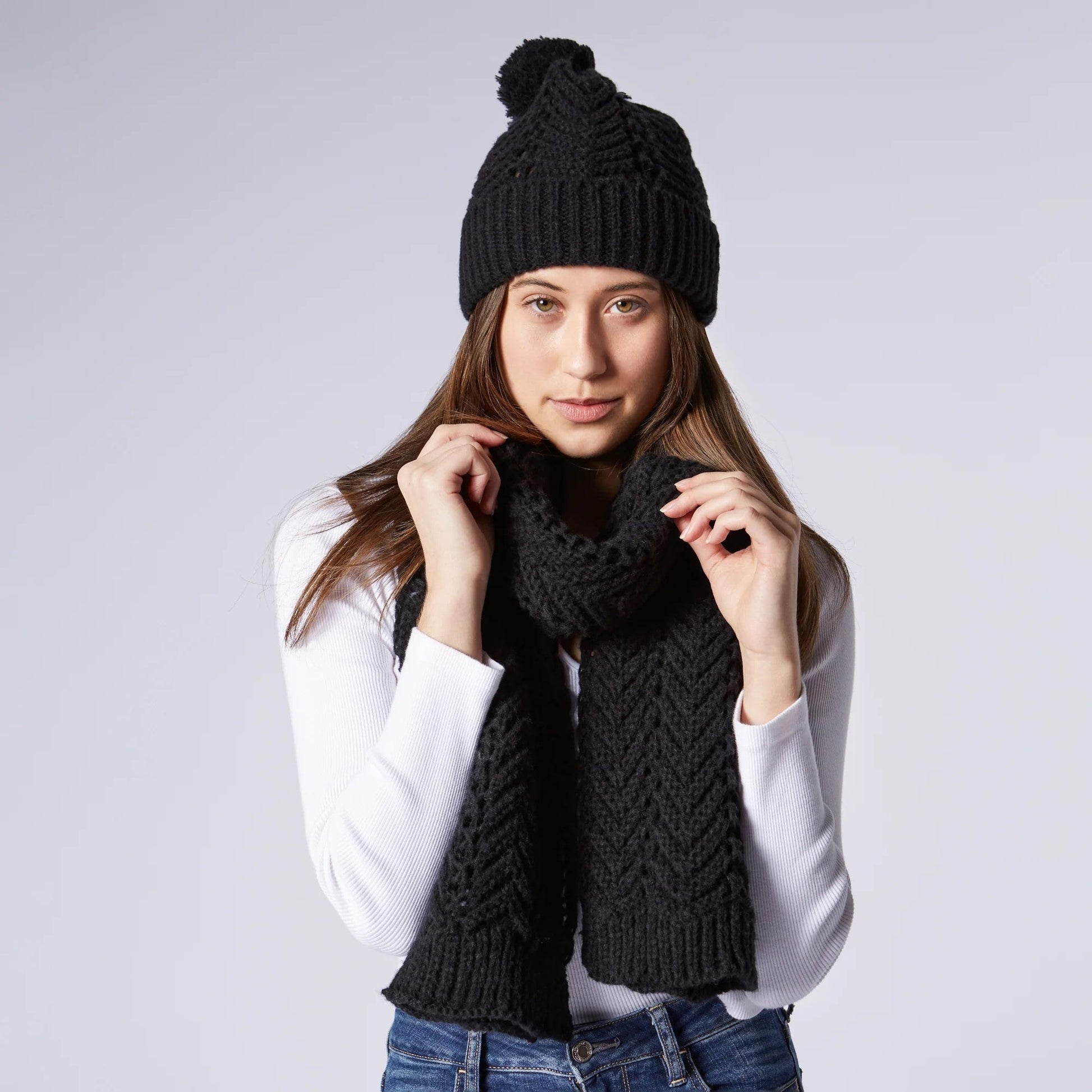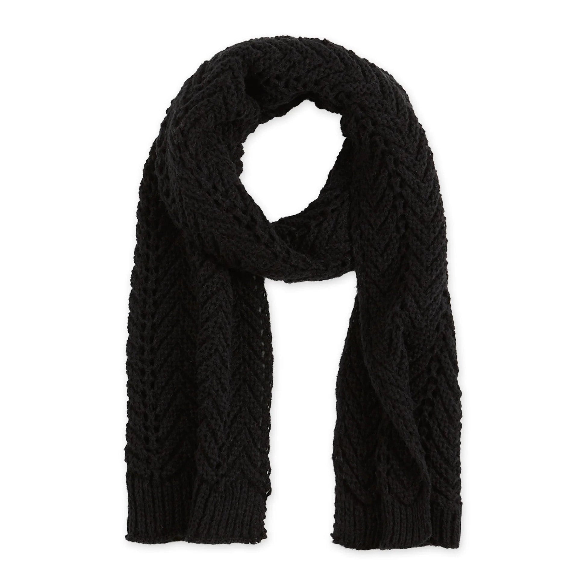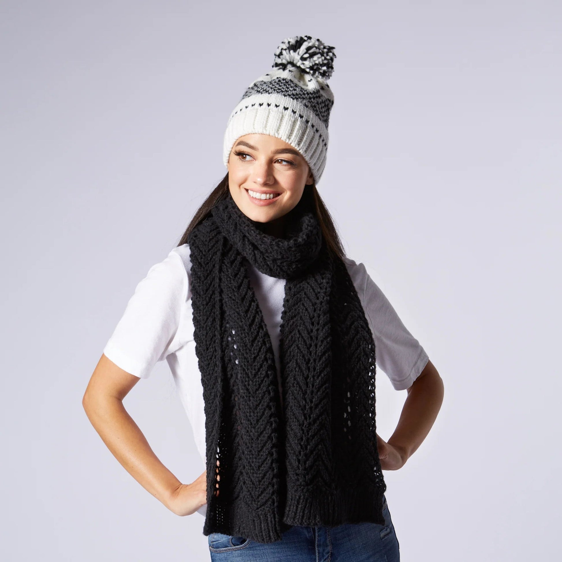 Stay cozy and stylish with Chevron Knit Scarf in Black. This warm scarf is the perfect gift for yourself or a loved one. Wrap yourself in comfort and chic all winter long.