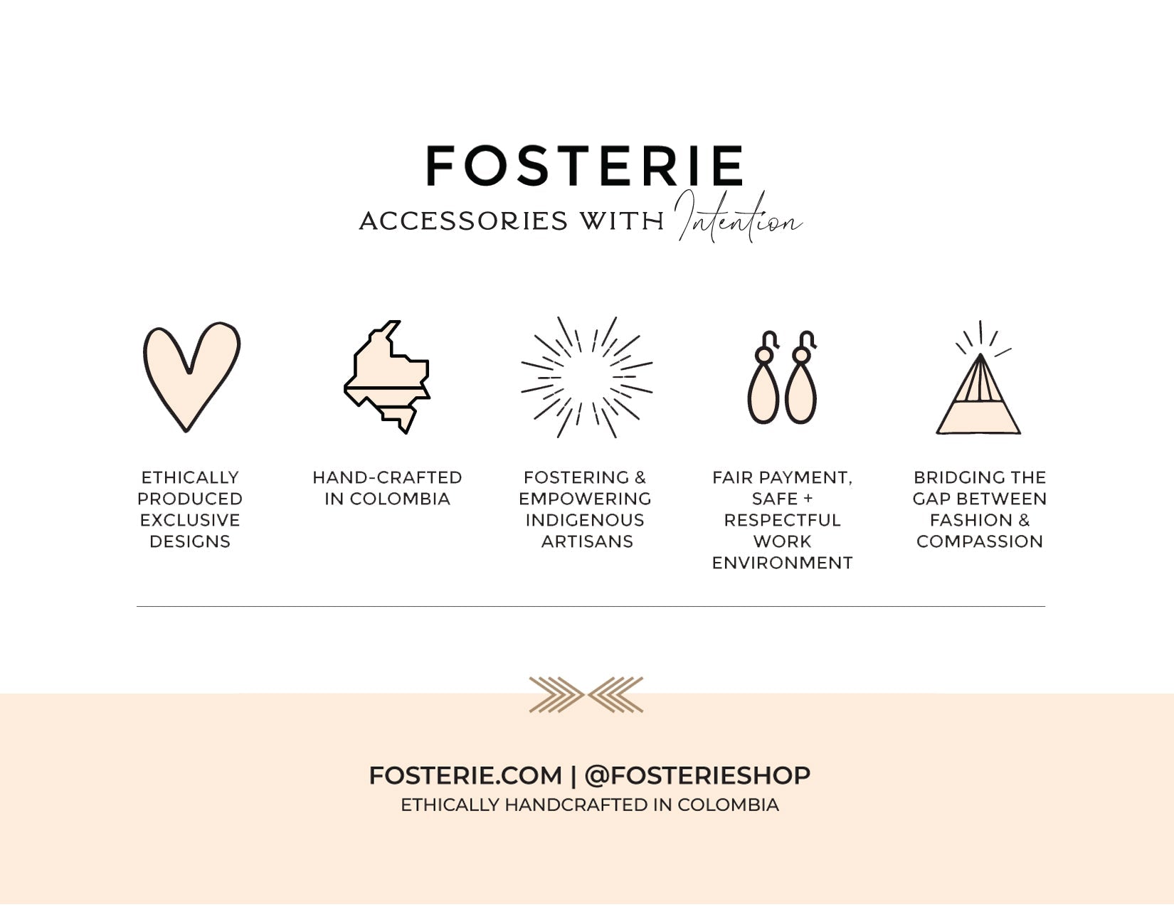 Founded on the belief that fashion + compassion can make a positive impact on the world, each FOSTERIE exclusive product is proudly and ethically handcrafted in Colombia by our team of indigenous Embera artisans. Our pieces have been infused with love + joy and our hope is that these sentiments remain each time you wear them. Your support provides a means of upwards social mobility for our makers, ensuring fair wages and safe, positive working conditions. Learn more about our mission + makers at Fosterie.com.