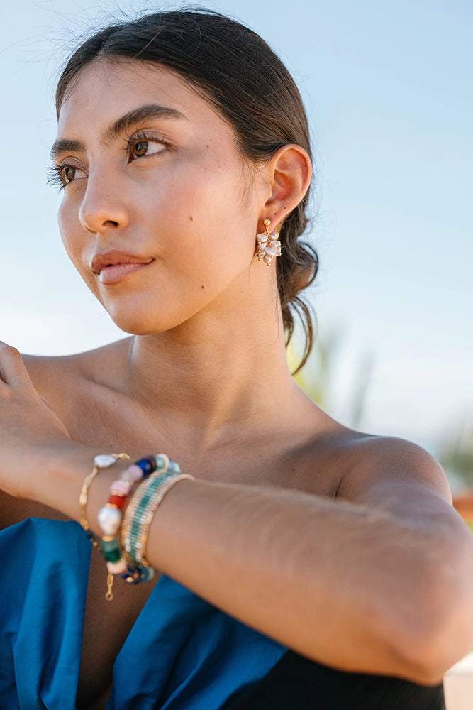 Strands of elegant fresh water cultured pearls cascade down for a classic gold statement earring. Gold plated brass makes this convertible earring truly timeless. Wear them long for a more dramatic impact, or loop them behind your lobes for a chic huggie earring.