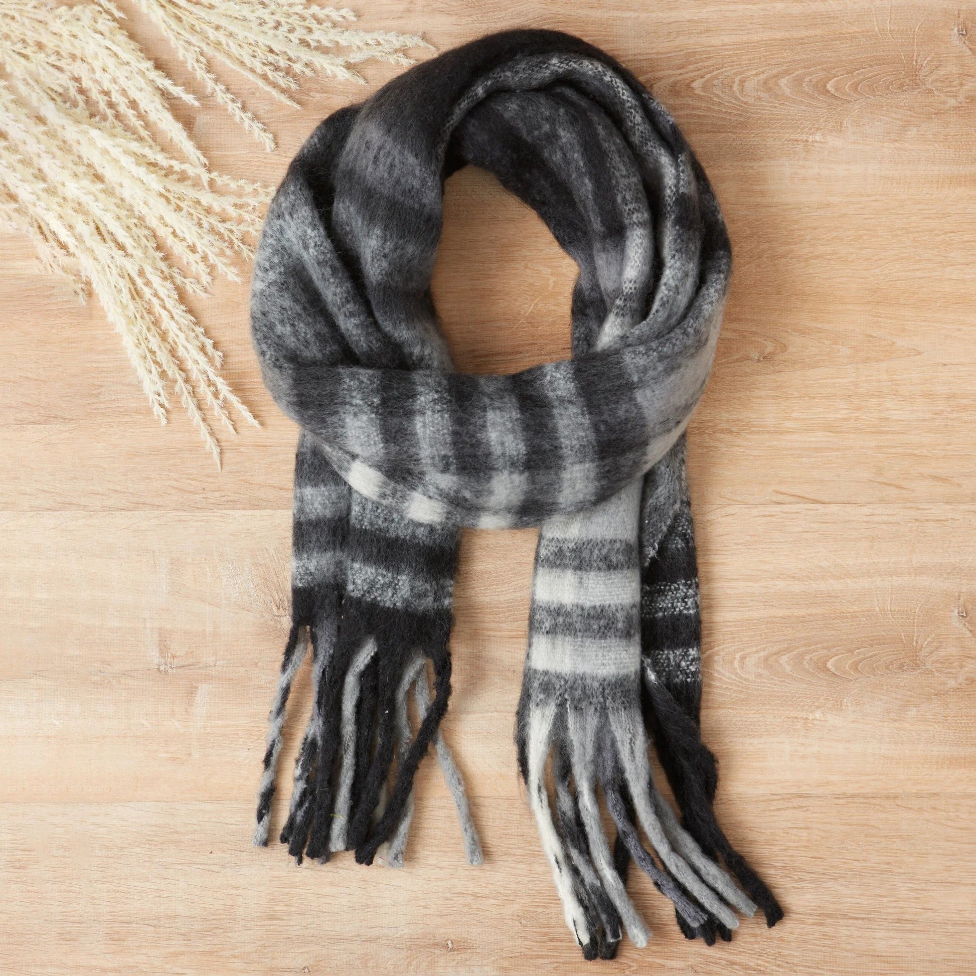 Cozy Plaid Fringe Gray Scarf | Mens / Unisex Winter Classic Plaid Pattern Scarf | 86" x 15"