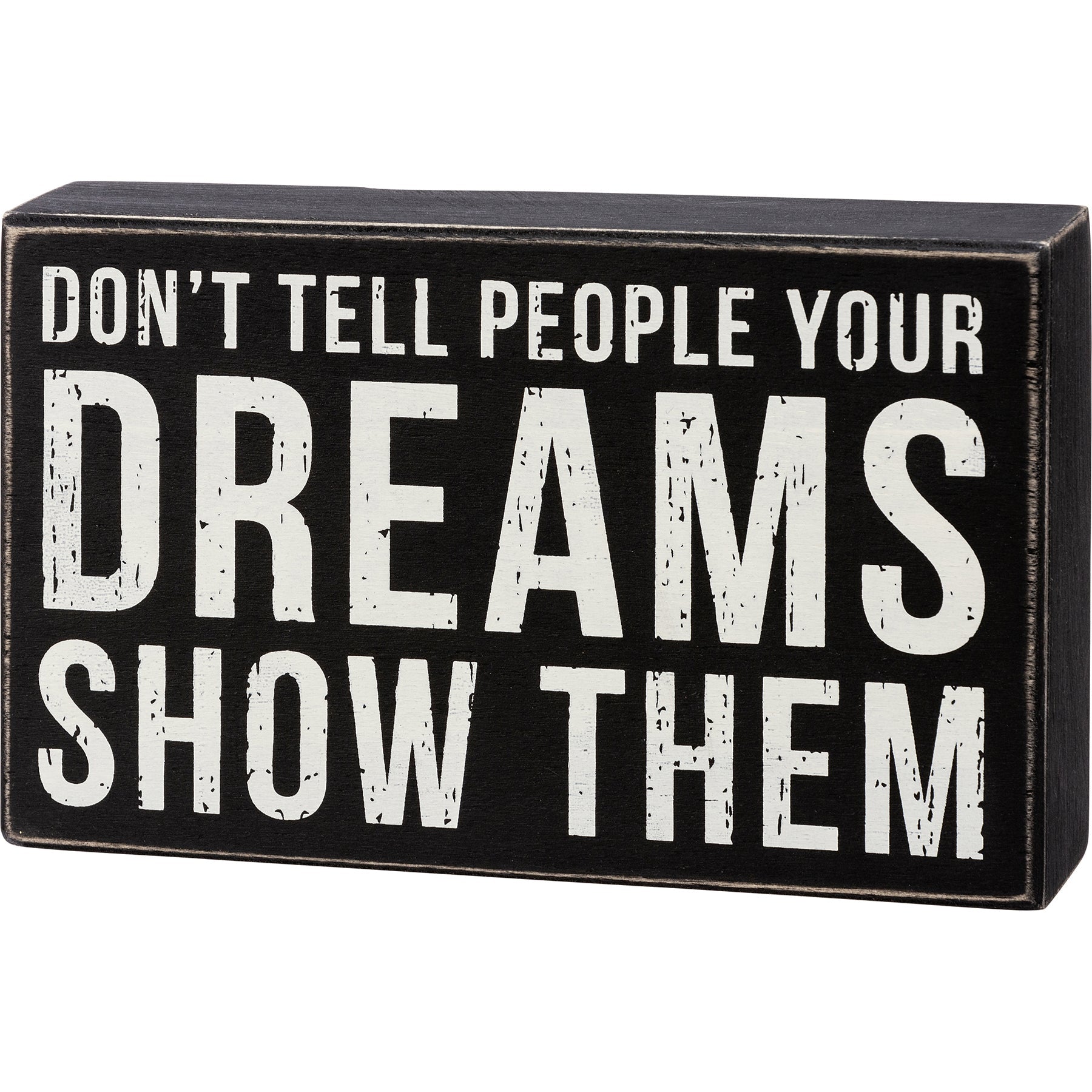 A classic black and white box sign featuring a distressed "Don't Tell People Your Dreams Show Them" sentiment.