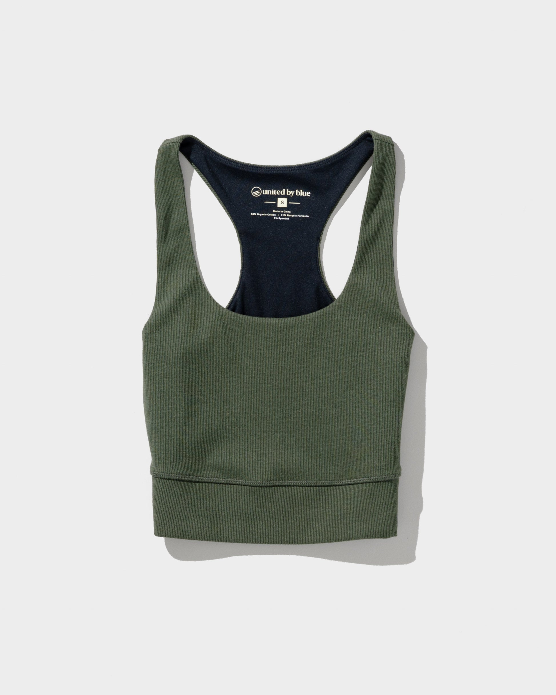 - Ribbed racerback sports bra with scoop neckline and 2.25” elastic band at bottom.