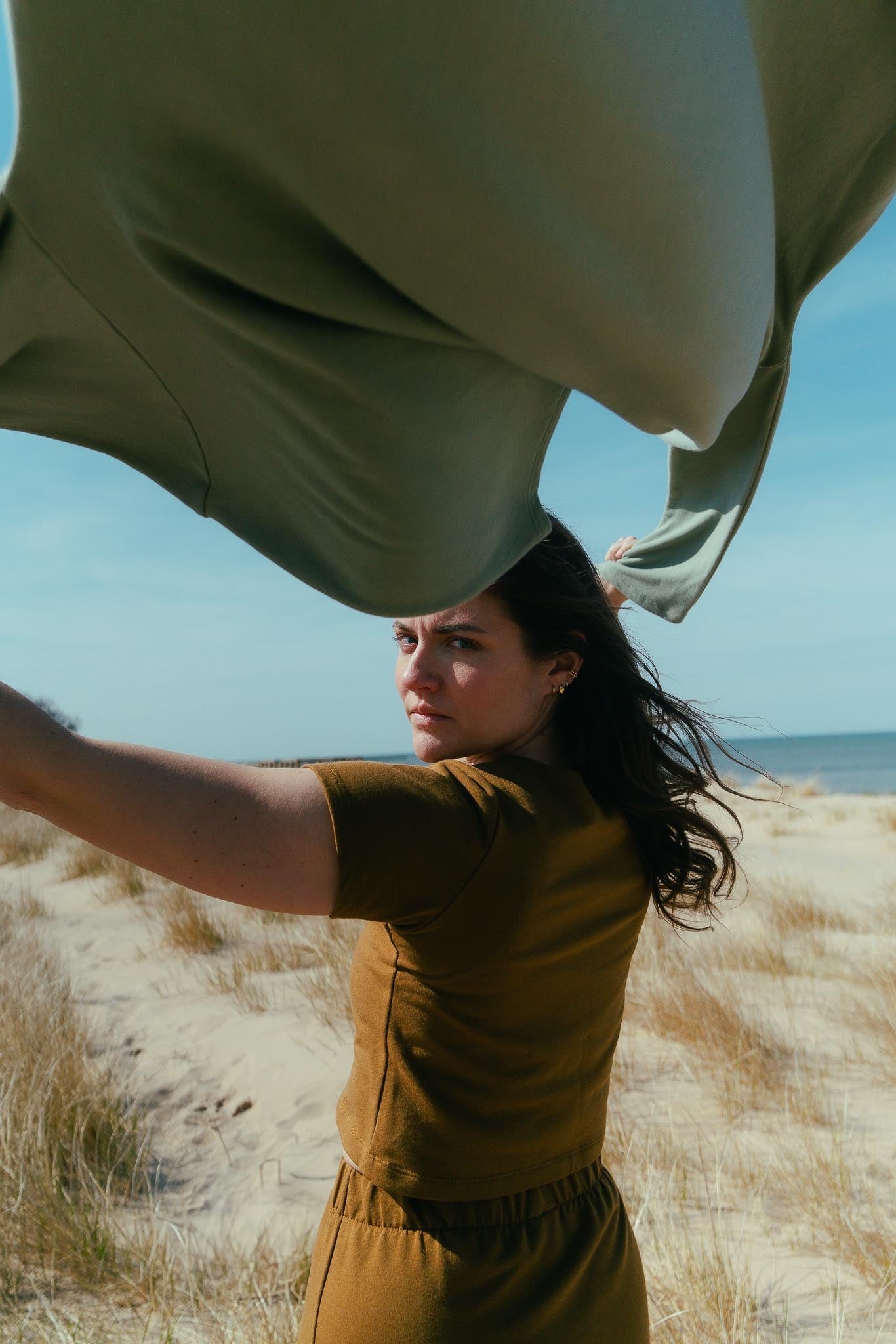 Our French Terry is soft, super stretchy and made from organic cotton! You can freely move or lounge in long-lasting 95% organic cotton and 5% spandex. Feel completely at ease in soft earth tones, 4-way stretch, and fabric that is flattering for all bodies.