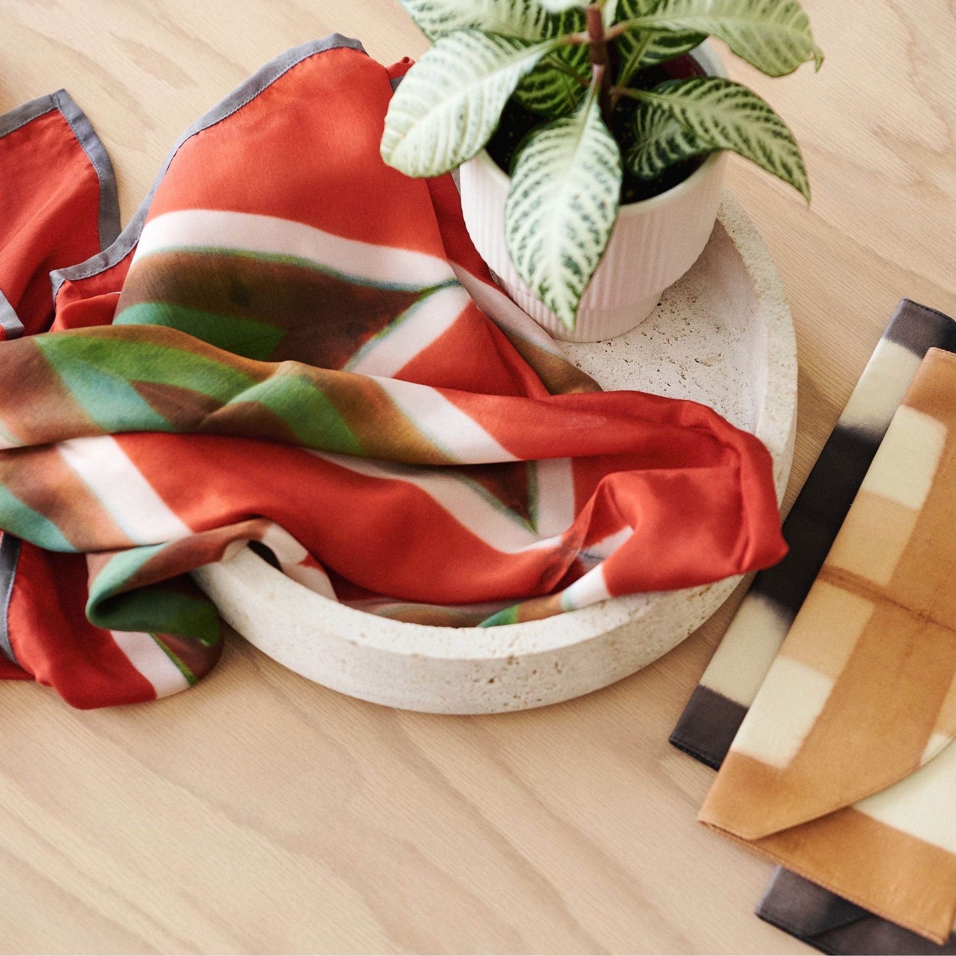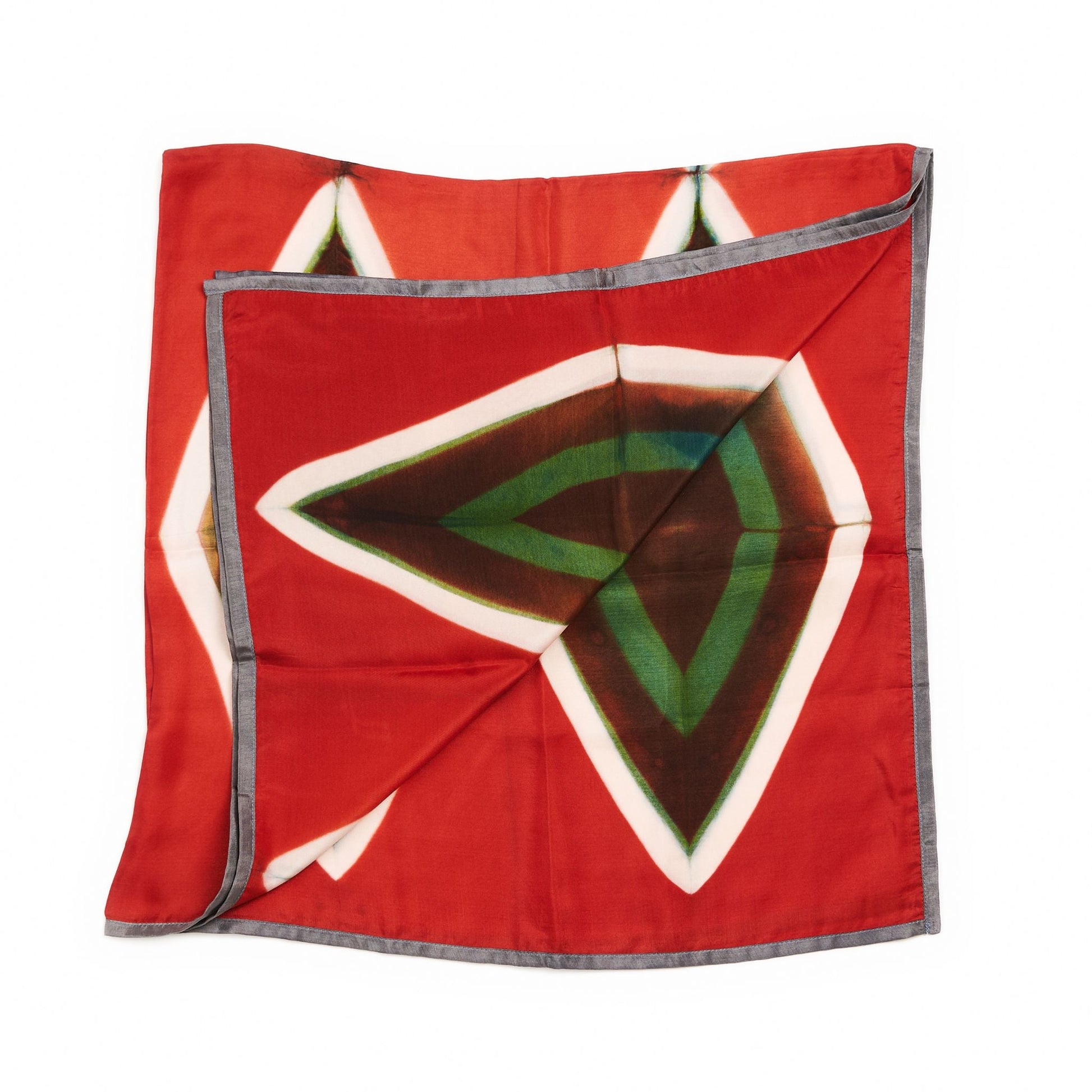 Classic in design, the repeat geometric pattern are all handcrafted by expert shibori artisans in India . Naturally dyed using organic biodegradable materials like acacia,  coffee, eucalyptus.  Created all by hand,  these scarves are made in small careful batches, each piece being unique as it is completely handcrafted using pure mulberry silk.