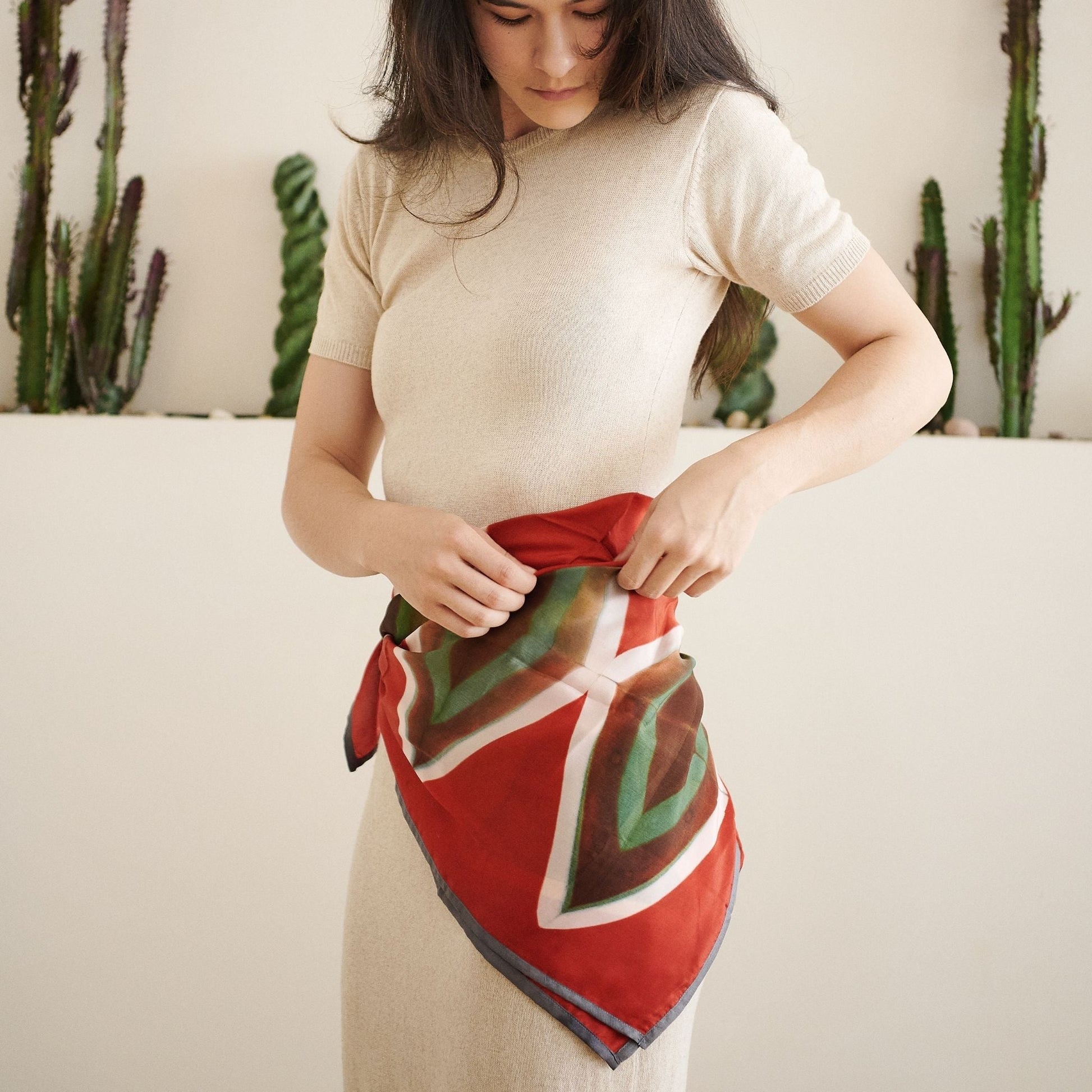 Each scarf has a silk hem in gray hues lifting the color palette of this multicolor square silk scarf, perfect for accentuating outfits for travel, leisure or gifting.
