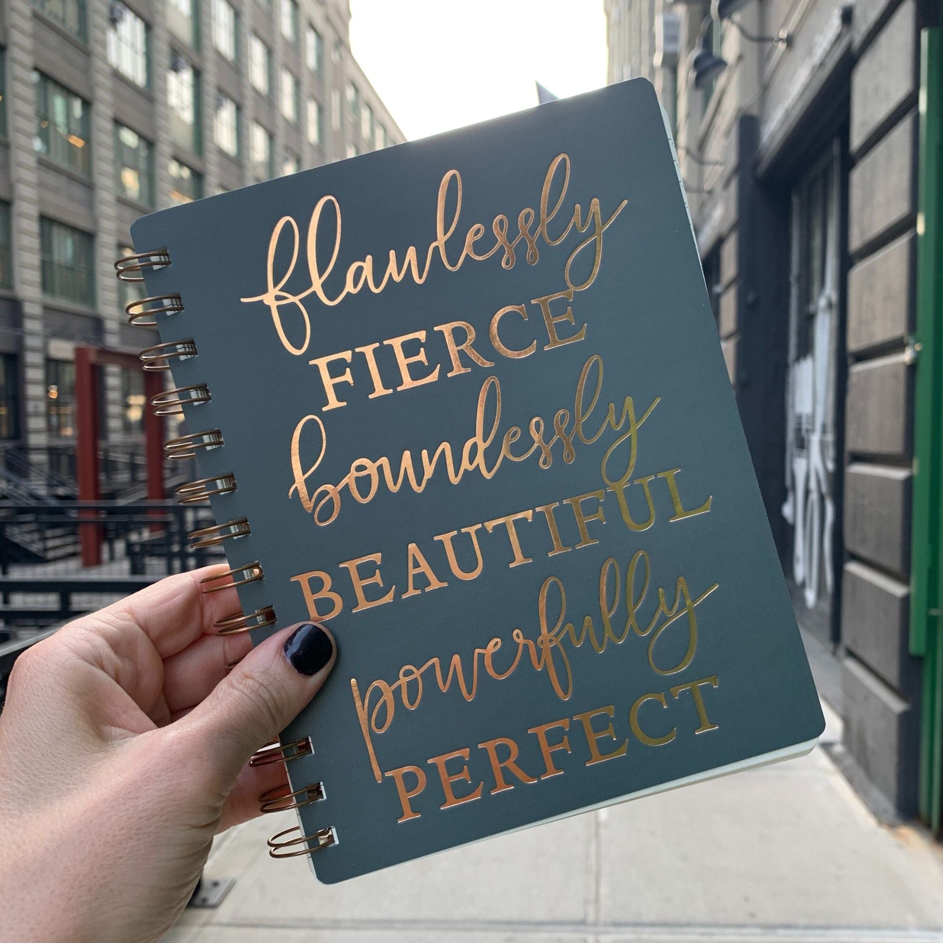 A double-sided spiral notebook featuring a metallic foil "Flawlessly Fierce - Boundlessly Beautiful - Powerfully Perfect" sentiment on a gray palette.