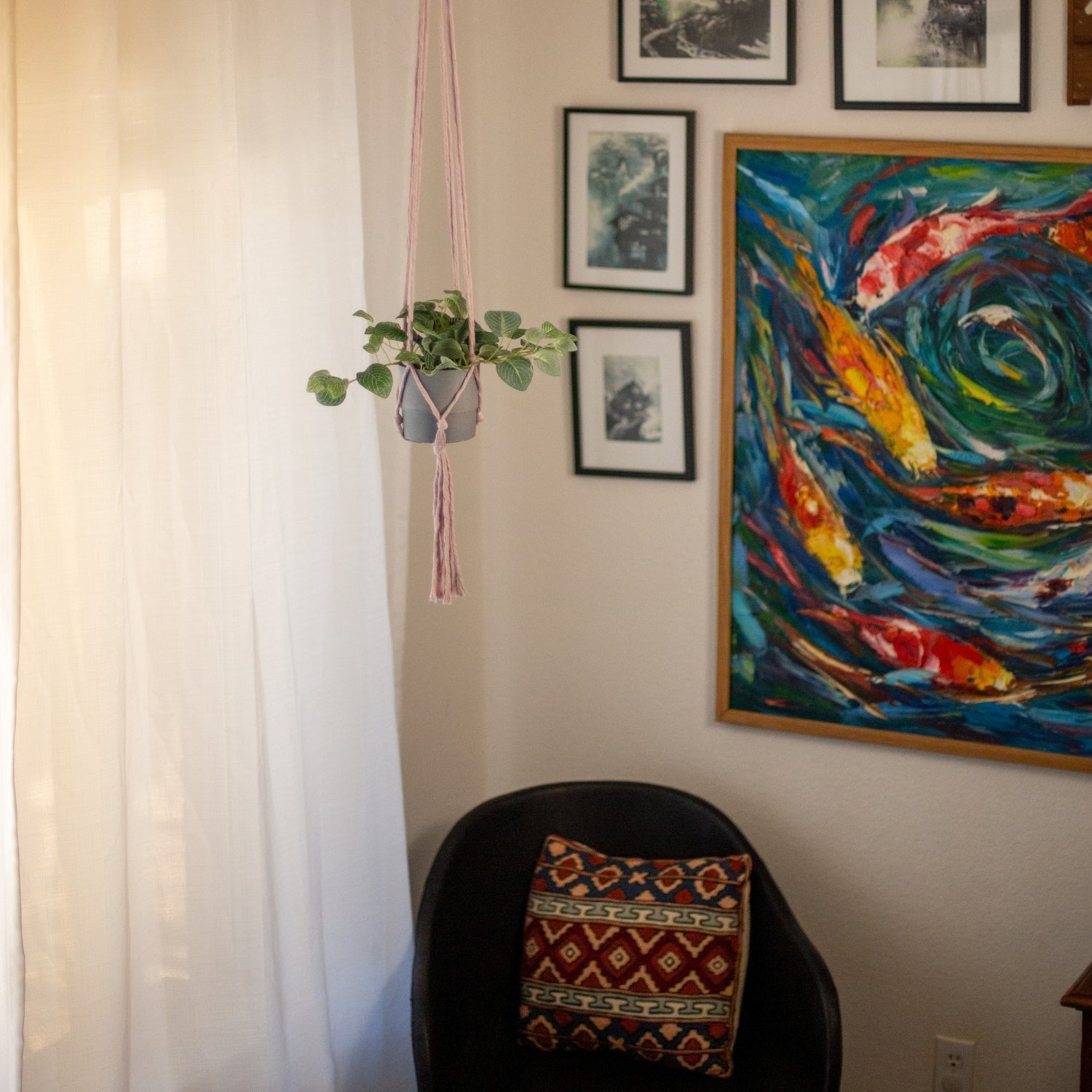 Our colorful, boho-inspired fair trade plant hanger is a perfect handmade home décor piece to brighten up any living room, nursery, or office. Hand crafted from cotton rope, this beautiful plant hanger will add style to your home, while helping provide dignified employment and holistic care for deserving women. It can accommodate small - medium planters of varying shapes. Materials: Cotton Rope, Wood Ring Size: The hanger portion measures approximately: 32" long (from wood loop to lower knot), and the tassels measure approximately: 6" long (from lower knot to end of tassel)