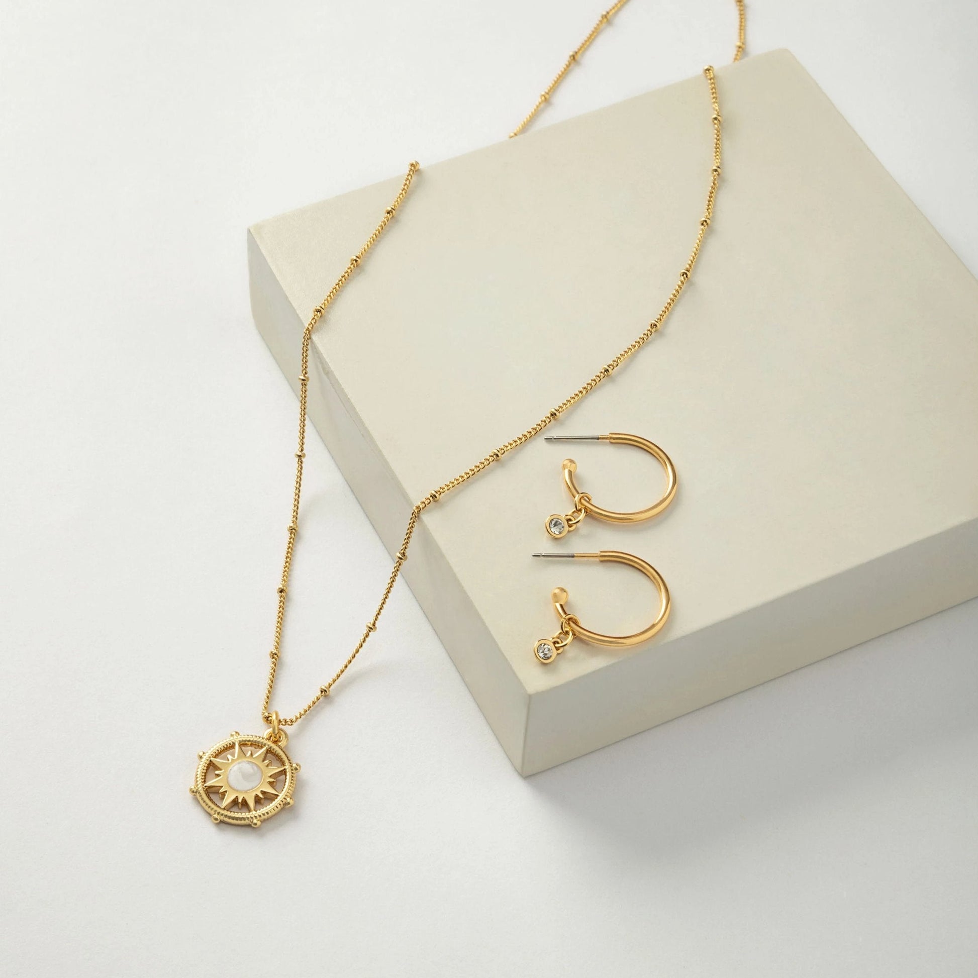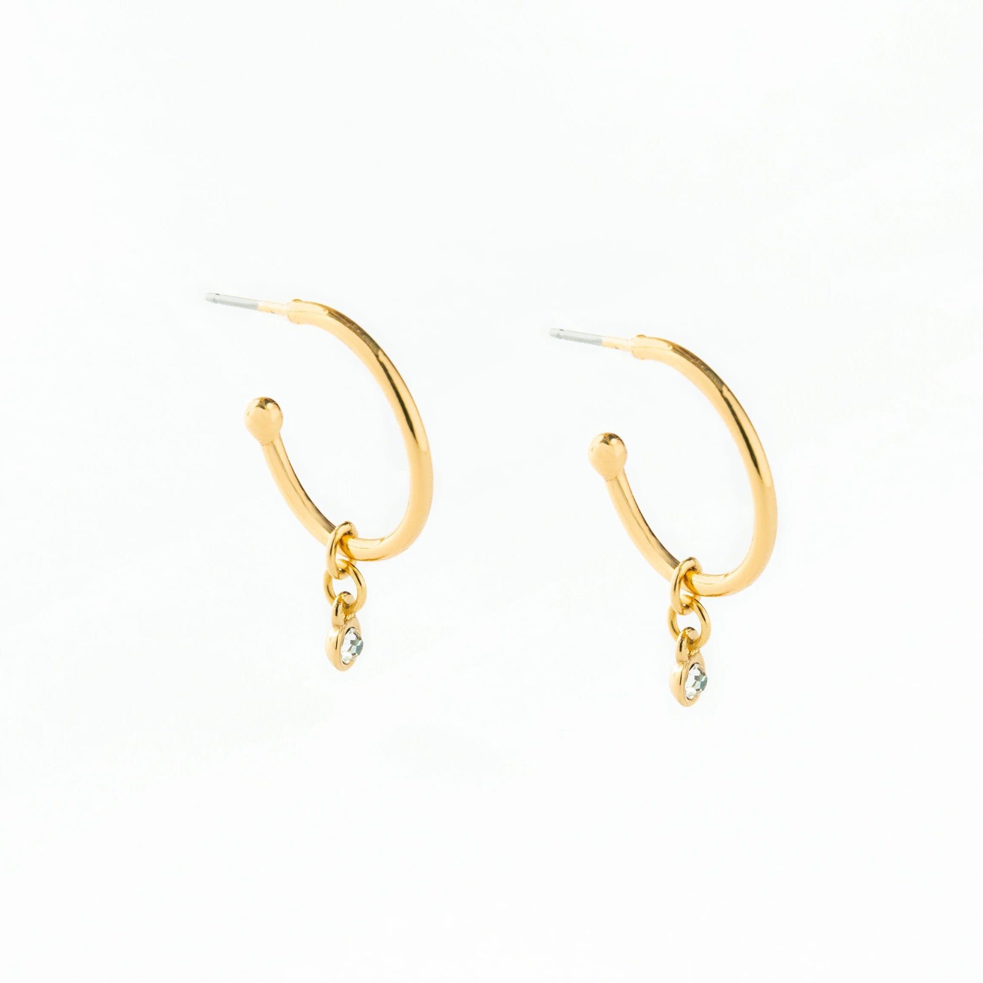 Perfectly pretty, our GEM HOOP EARRINGS cover the huggie trend in comfort. An always classic hoop accented by a beveled glass crystal drop for a hint of sparkle. Plus, take advantage of it's 2-in-1 capability by sliding the gem up and over the post. The perfect pairing for our thin GEM CHOKER or LAYERED GEM NECKLACE.