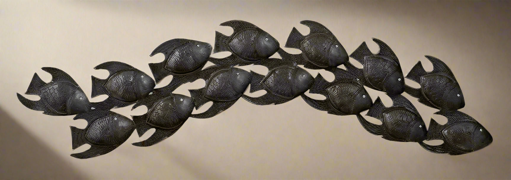 26" x 8" The fish that swim together stay together! This group moves effortlessly and gracefully along. Made by Gaby Alcidon.
