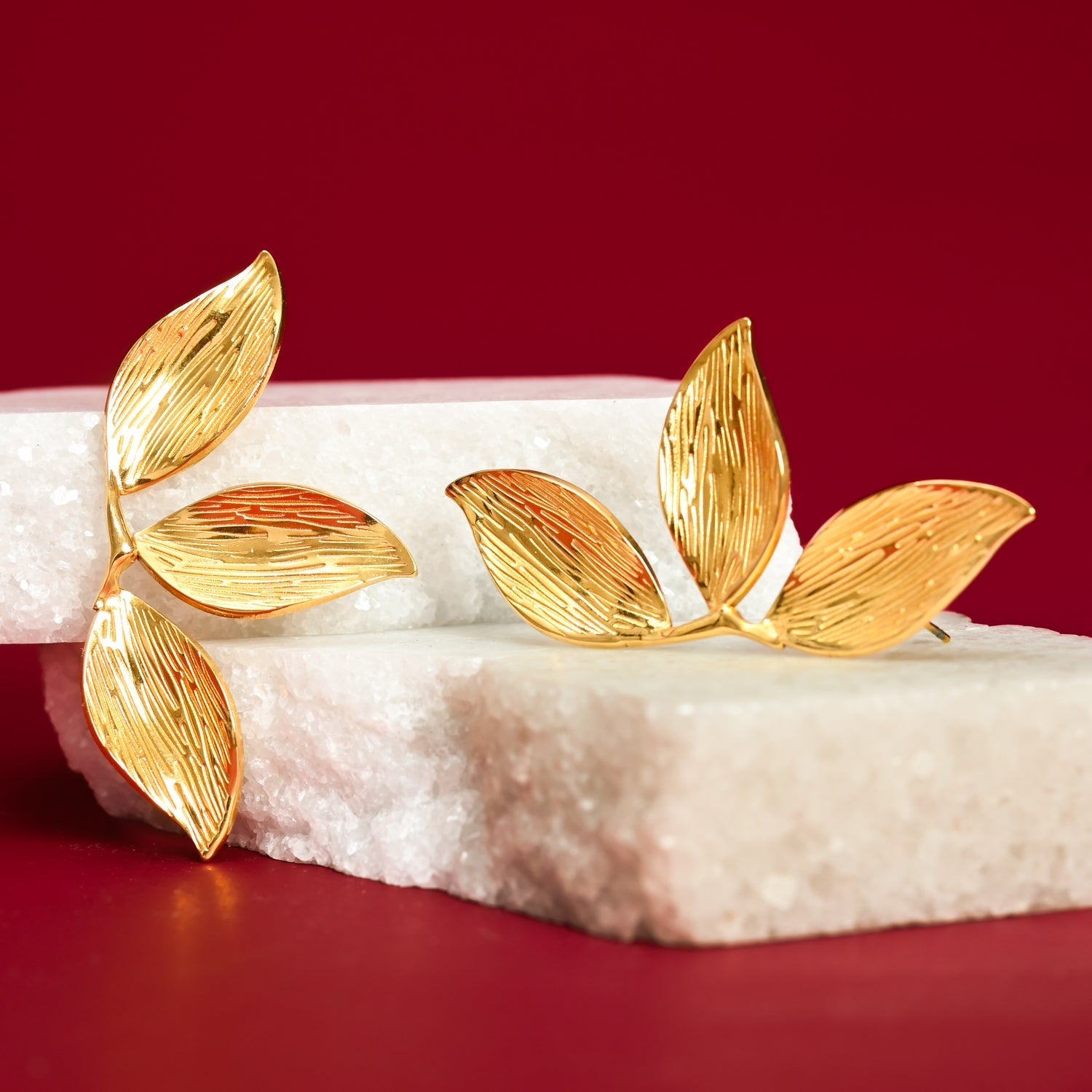 Make a bold yet elegant statement with the Golden Canopy Earrings. Inspired by the beauty of nature, these 18K gold plated, leaf-shaped earrings feature a striking structural design that effortlessly elevates any outfit. Whether you’re dressing up for a special occasion or adding a touch of sophistication to your everyday look, these earrings are the perfect choice. Each pair represents a journey of renewal and hope, as they are crafted by women rediscovering their strength and independence. With every purchase, you help create a world where second chances bloom. Box size and color may vary. Materials:18k gold plated stainless steel earrings Hypoallergenic; lead and cadmium free with nickel content less than100ppm. Size: 2 inches