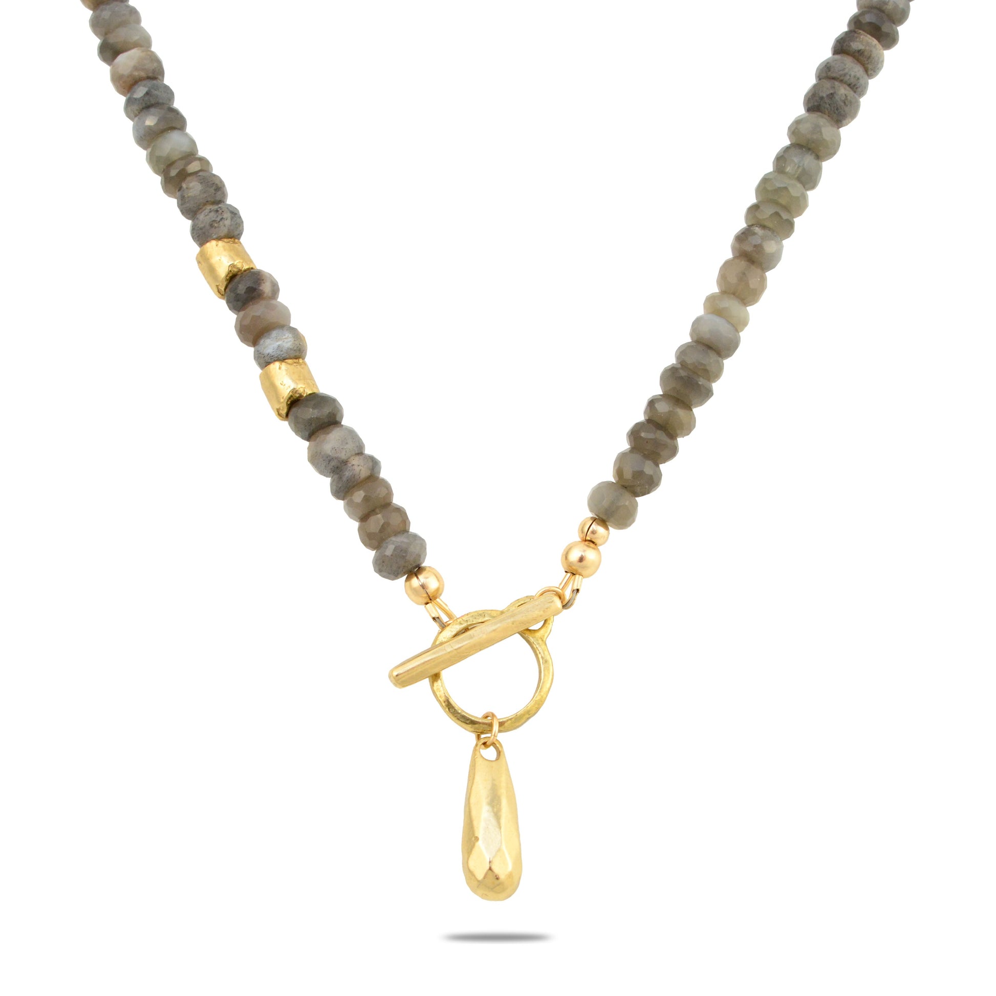 The Golden Teardrop Moonstone Necklace by Collection 1304 is a stunning interplay of natural beauty and artisanal craftsmanship. Featuring faceted labradorite beads with their signature iridescent shimmer, this necklace highlights the captivating interplay of light and earthy hues. At its center is a handcrafted golden bronze toggle clasp, complemented by an elegant teardrop pendant that adds a radiant, sculptural touch. Perfect for elevating everyday looks or completing a formal ensemble, this piece is as versatile as it is exquisite. Proudly made in the USA, the Golden Teardrop Moonstone Necklace embodies timeless elegance and artistry.