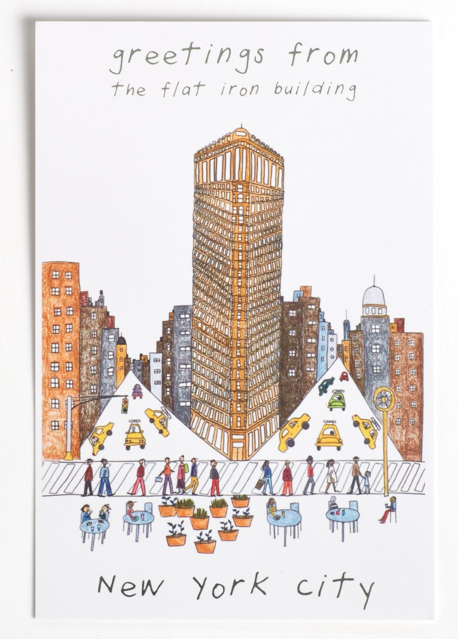 Celebrate the charm of New York City with this postcard featuring a hand-drawn illustration of the iconic Flatiron Building. Designed as a collectible for travel and tourism lovers, it captures the building’s distinctive architecture with artistic flair, making it a perfect memento or thoughtful greeting from the city’s historic heart. Size: 4" x 6"