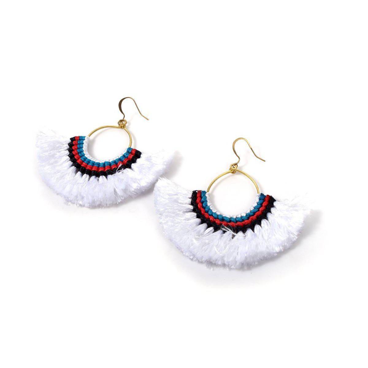 Our Half Moon Tassel Earrings are handcrafted in Thailand by our artisan partners in the highlands to Chiang Mai. They come in fun, vibrant colors perfect for any outfit! They are made with 3 colors of cotton wax string.