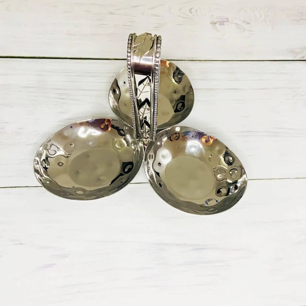 Make a statement at your next gathering with this elegant Hammered Willow Nut Bowl. All eyes with be on the beautiful golden willow leaves and the silver beaded trim of the center handle. Three hammered silver bowls are ready to fill with delicious nuts, olives, and other nibbles.