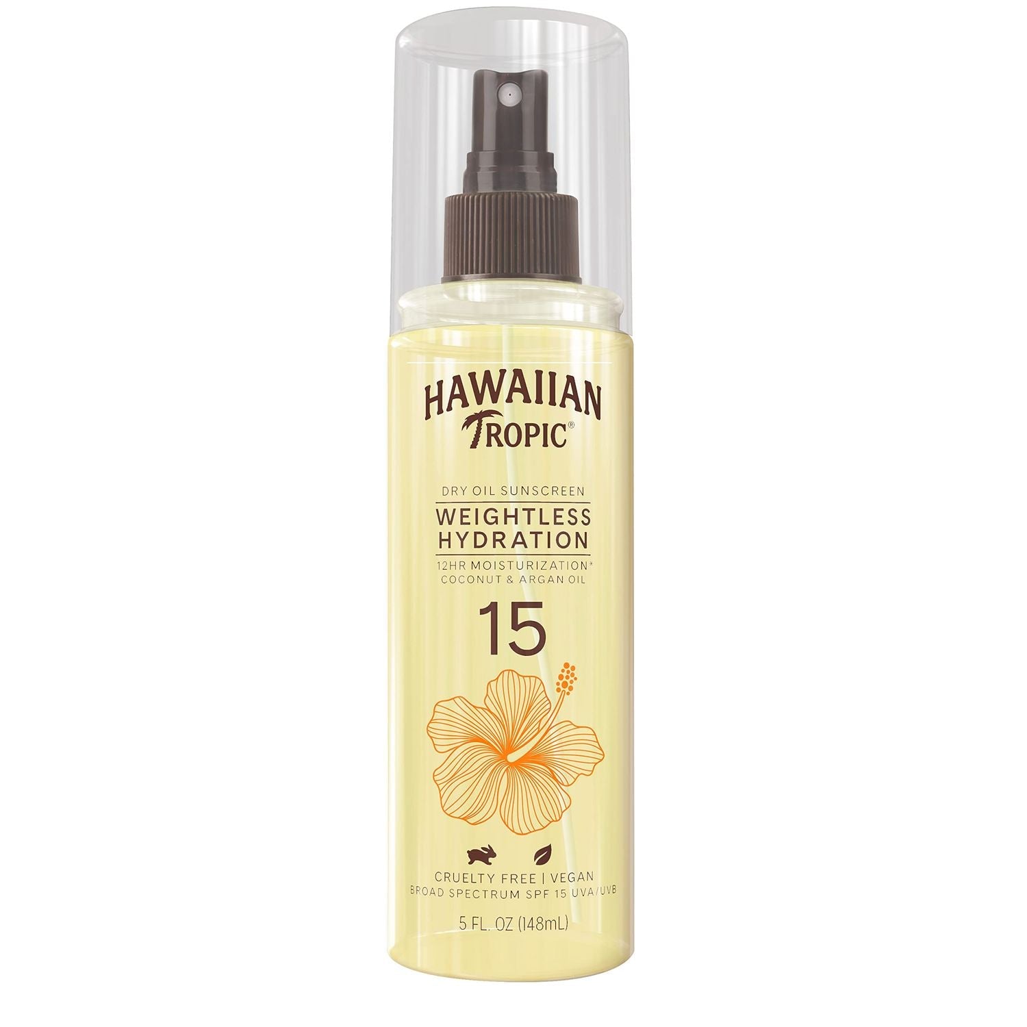 For skin loving sun protection, try the Hawaiian Tropic Silk Hydration Weightless Dry Oil Mist. This tropical scented sunscreen mist is fast absorbing and non-greasy, making it ideal for every day use on all skin tones. The dry oil is made with a blend of Coconut, Argan, Grapeseed and Olive Oils to moisturize your skin for 12 hours and does not contain added parabens. It is also water resistant for up to 80 minutes and offers broad spectrum UVA/UVB protection. In addition to caring for your skin, Hawaiian Tropic is also doing its part to responsibly help care for the environment by formulating sunscreens that are PETA-certified Cruelty-Free, reef friendly and free from oxybenzone and octinoxate. This Dry Oil Mist is also available in SPF 30. Cruelty FreeA product has an independent third-party certification on pack or unqualified on-pack marketing claim relating to being cruelty-free and/or not tested on animals. HSA/FSA EligibleRestrictions apply; contact your insurance provider about plan allowances and requirements.