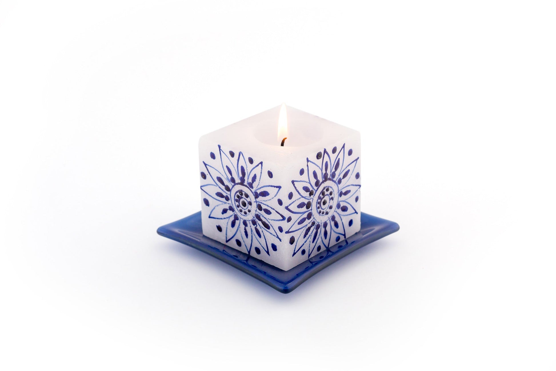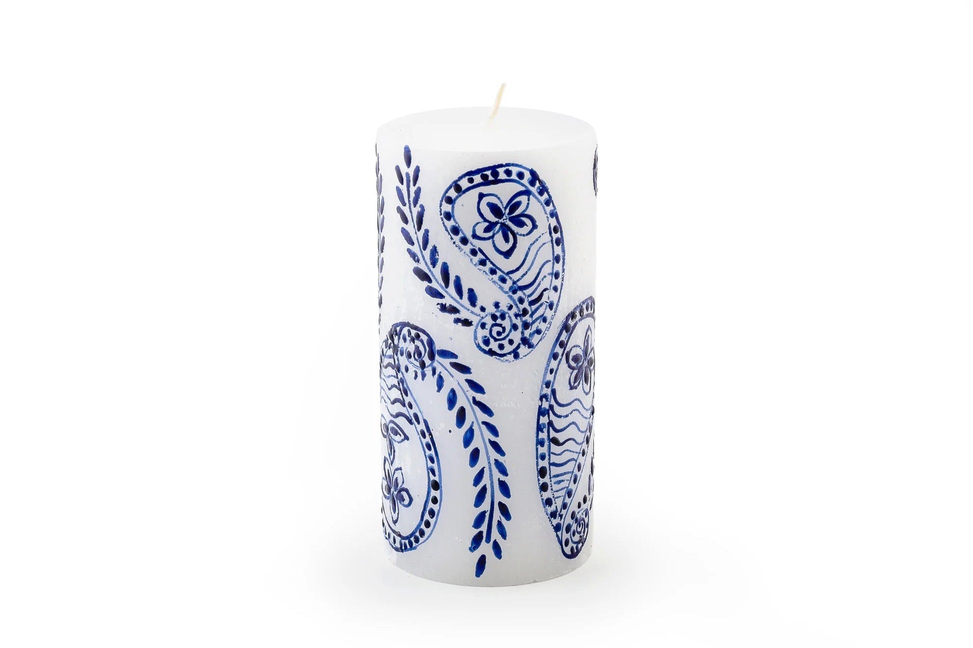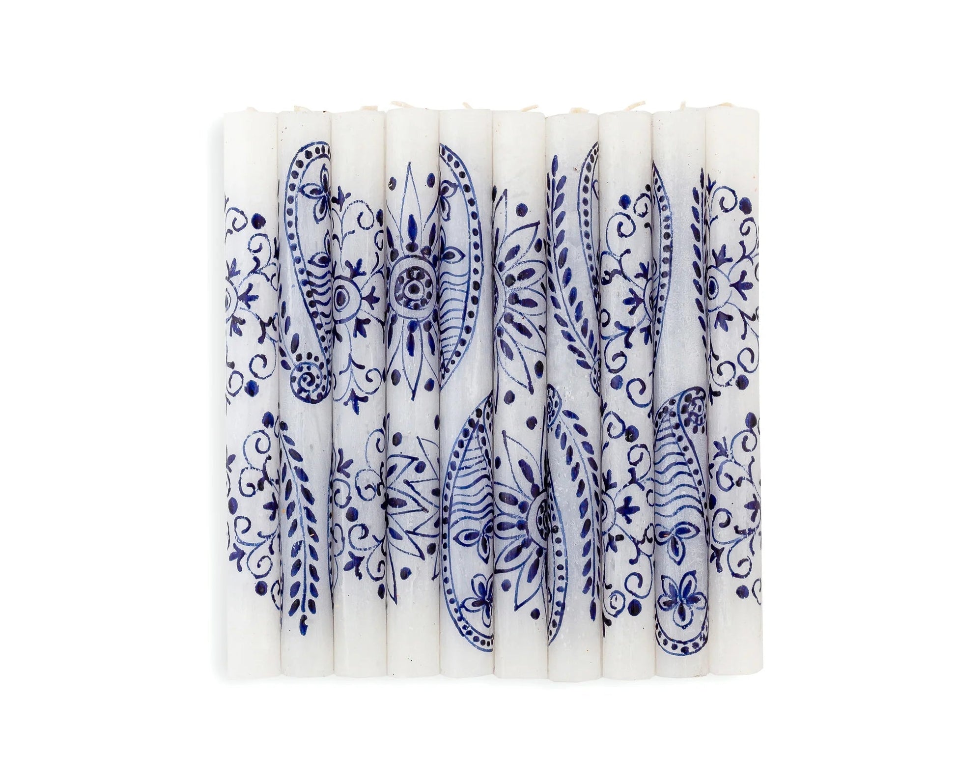 Lace up your table with these Henna Blue on White candles! *Lovingly hand poured and hand painted in South Africa. *Crafted primarily by single mothers from the local rural community. *On average, the artisans support an extended family of 12-15 people. PRODUCT DESCRIPTION: *Highest quality natural paraffin wax with 100% cotton wick *Unscented, smokeless, and free from added toxins *Tapers packaged as a matched pair *Each candle is uniquely made. Your delivered candle will likely appear slightly different from the website photo, but consistent with the theme of the collection. CANDLE CARE: *First burn time: 1-hour for every inch diameter *Wicks should always be cut to ¼” prior to lighting *Avoid drafts – they cause dripping! *Ensure candles are extinguished prior to leaving the room Learn more about the hands that make this Fair Trade product!