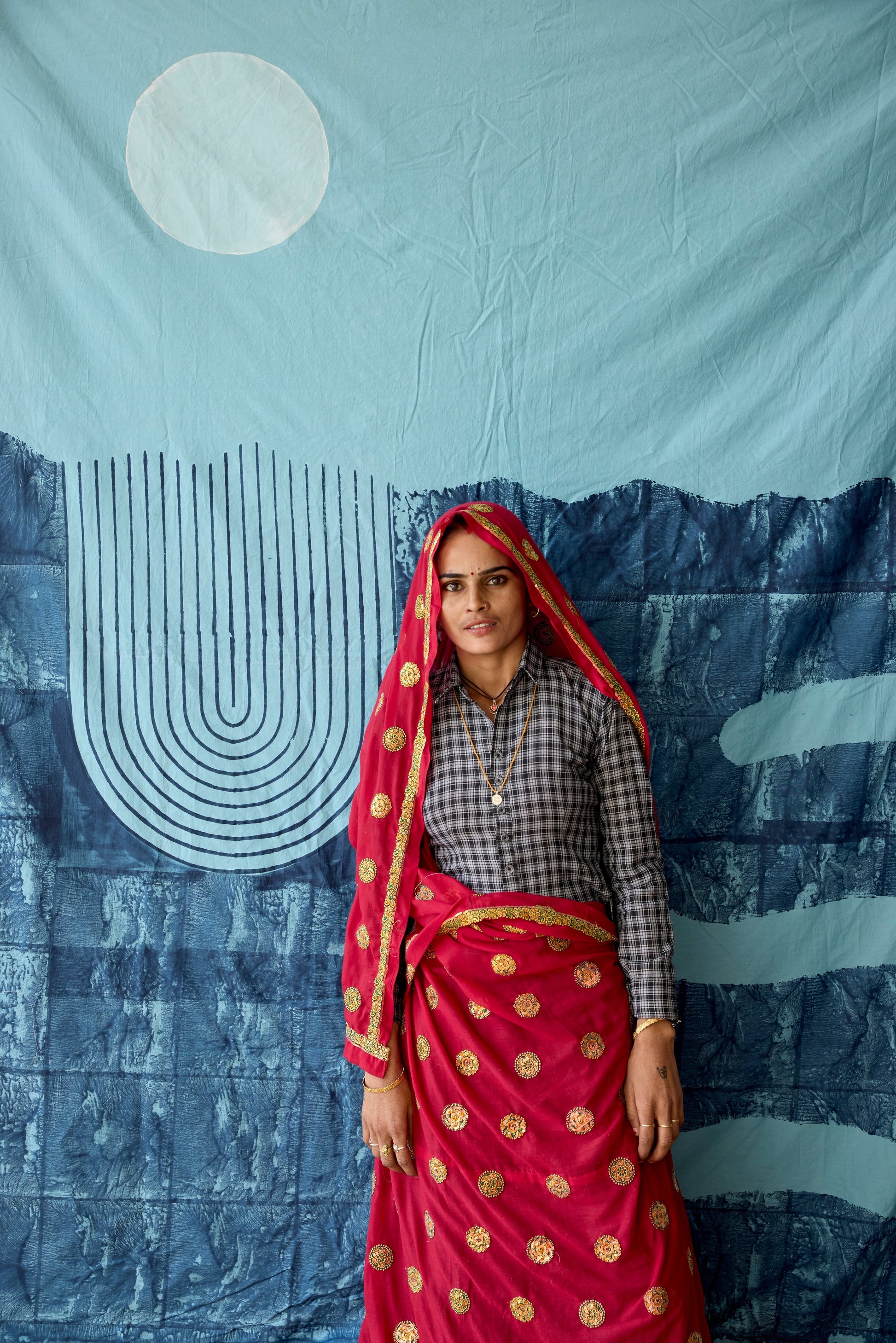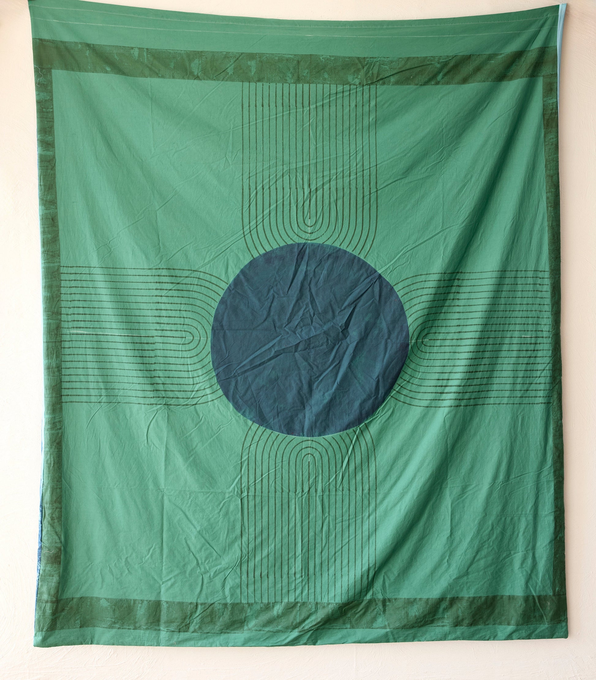 Create a tranquil, calming atmosphere in your bedroom with our reversible hand-printed duvet cover. One side features a serene green and deep blue circle motif for a calming atmosphere, while the reverse displays a striking moon against a rich blue background with abstract stripes, perfect for a bold, artistic touch.