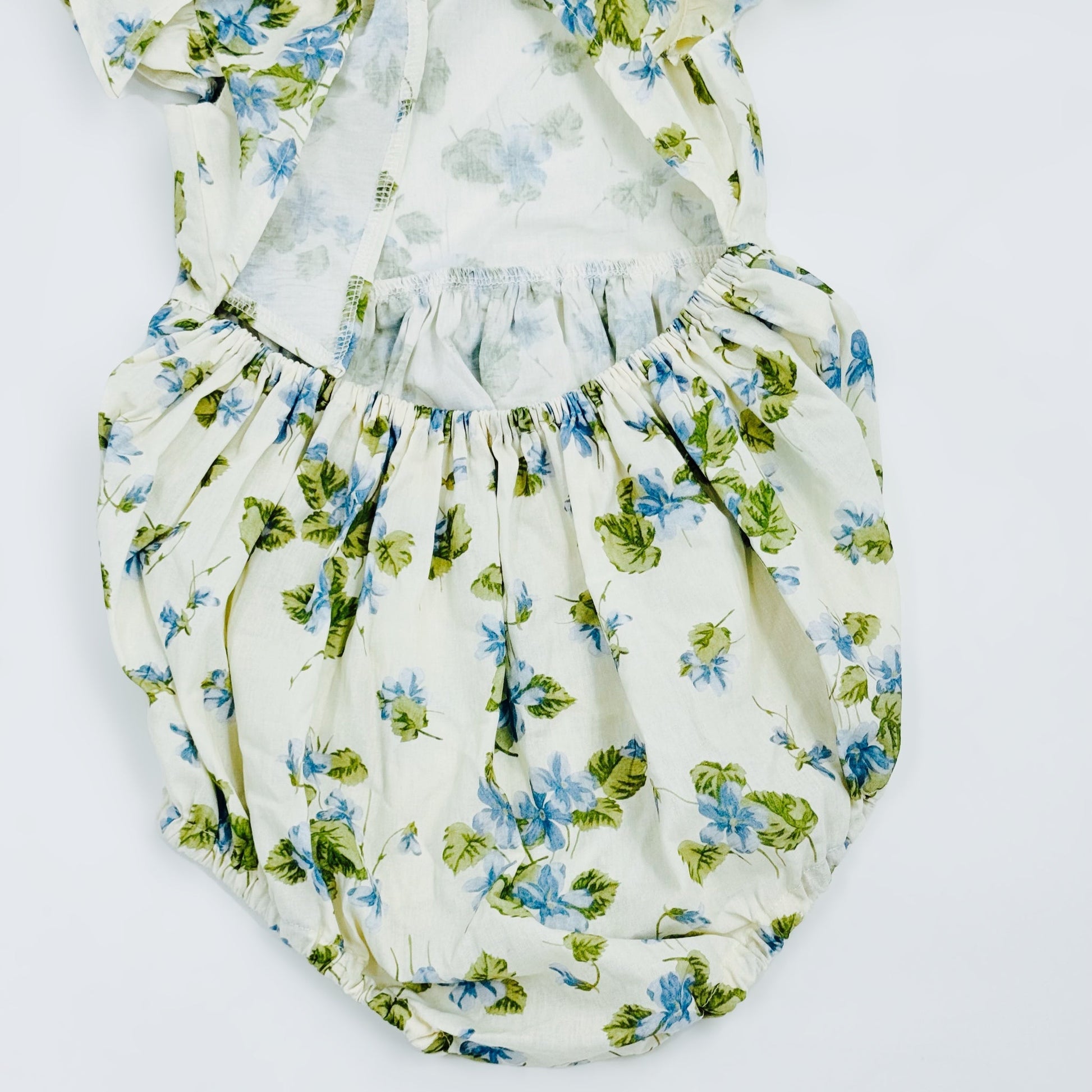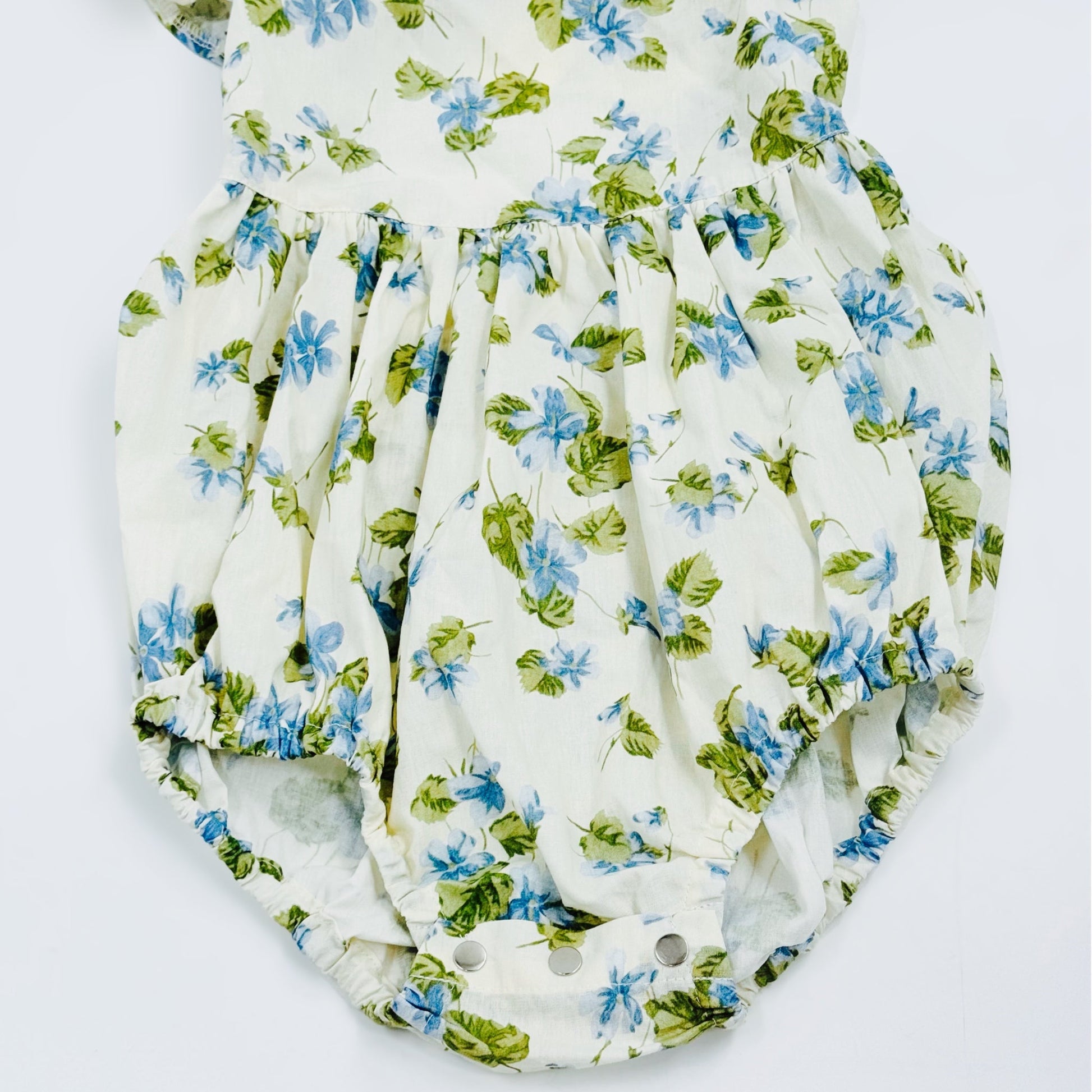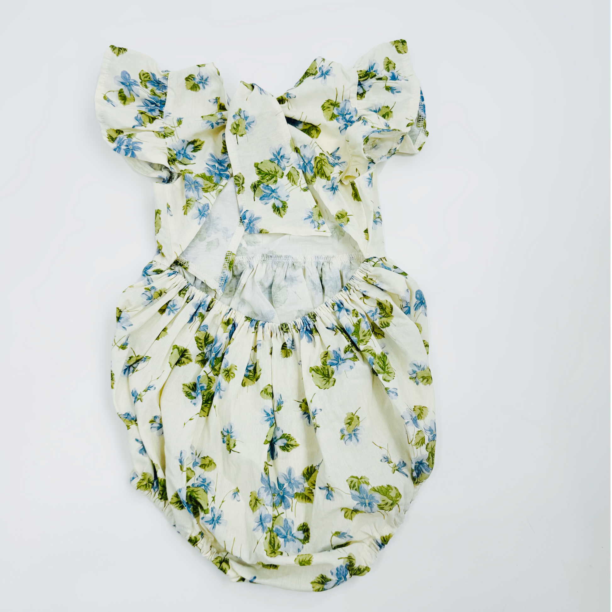 The Josie Romper is made with organic cotton fabric, featuring flutter sleeves, elastic leg openings, and a snap bottom for effortless changing. The tie back closure adds a touch of style and functionality.