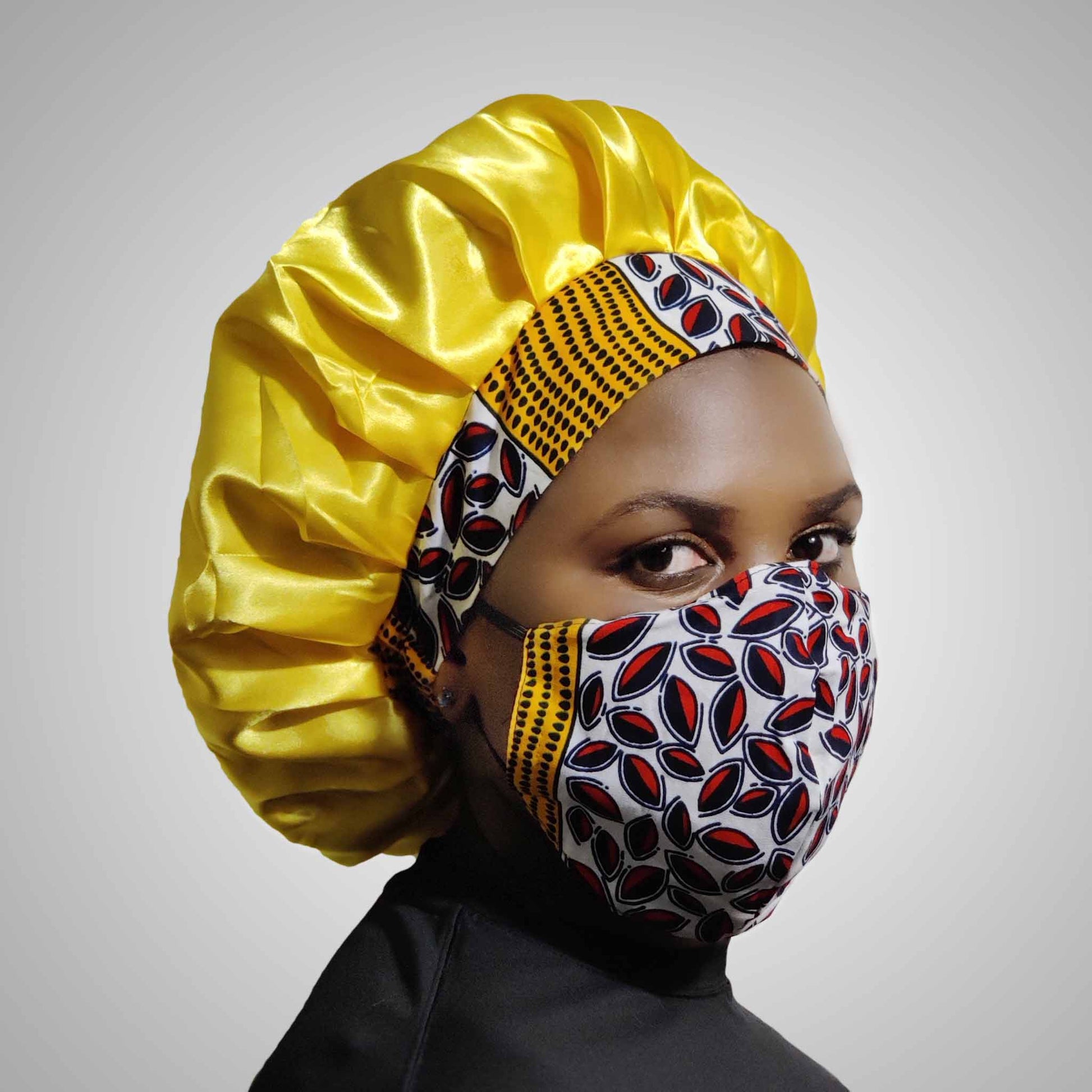 The Kente masks is made with triple layers of Ankara cotton fabric and is finished with a double elastic band that goes around the head from ear to ear.
