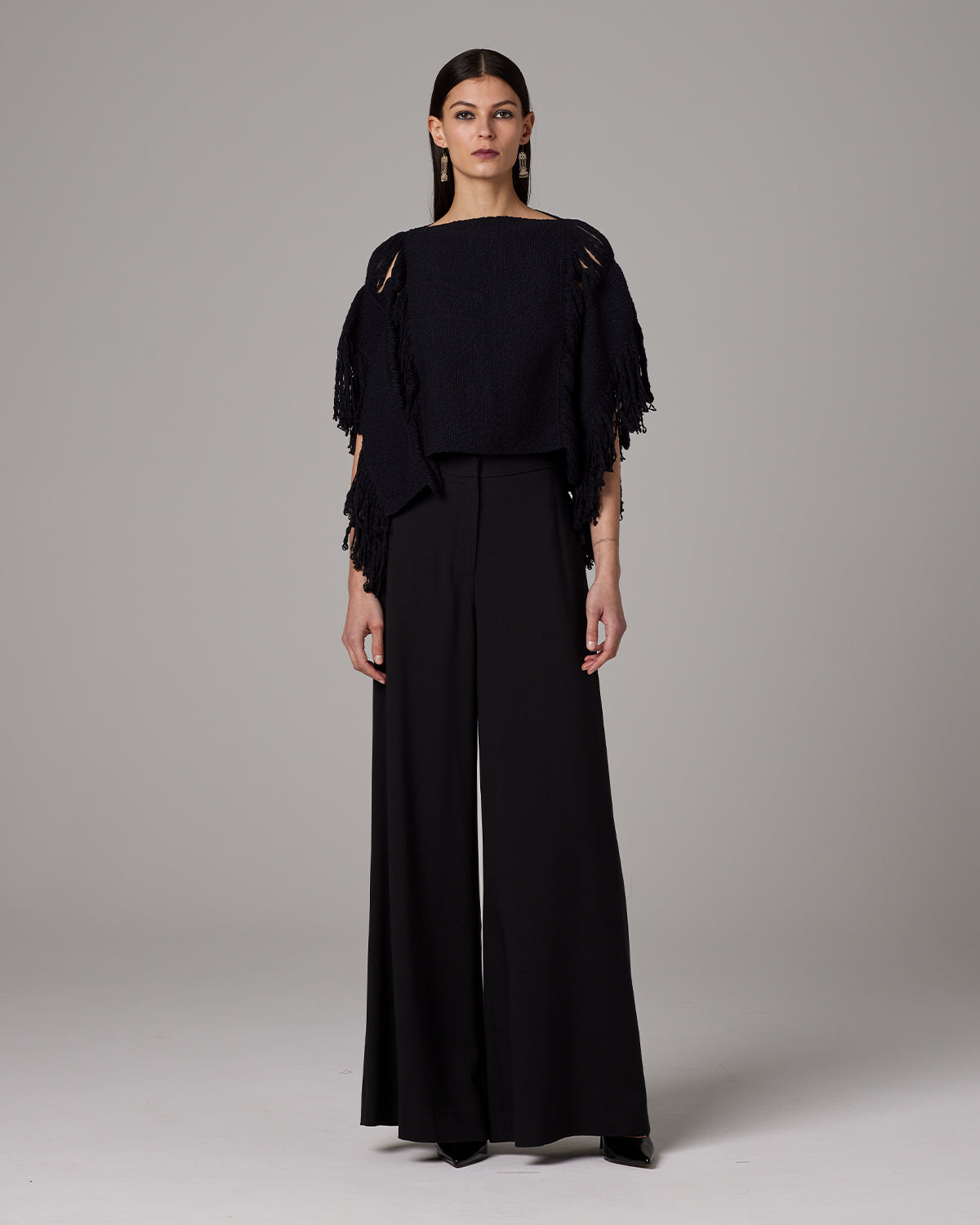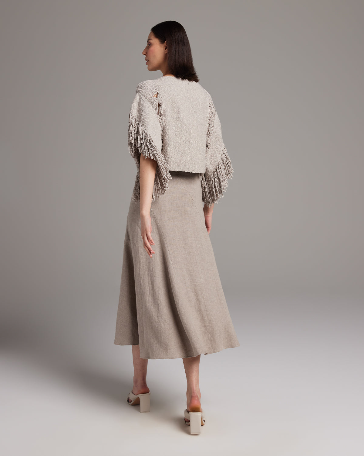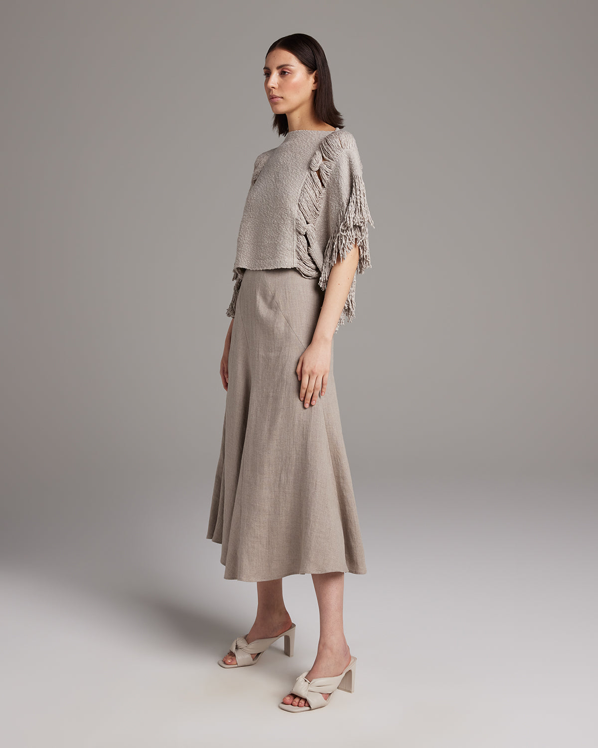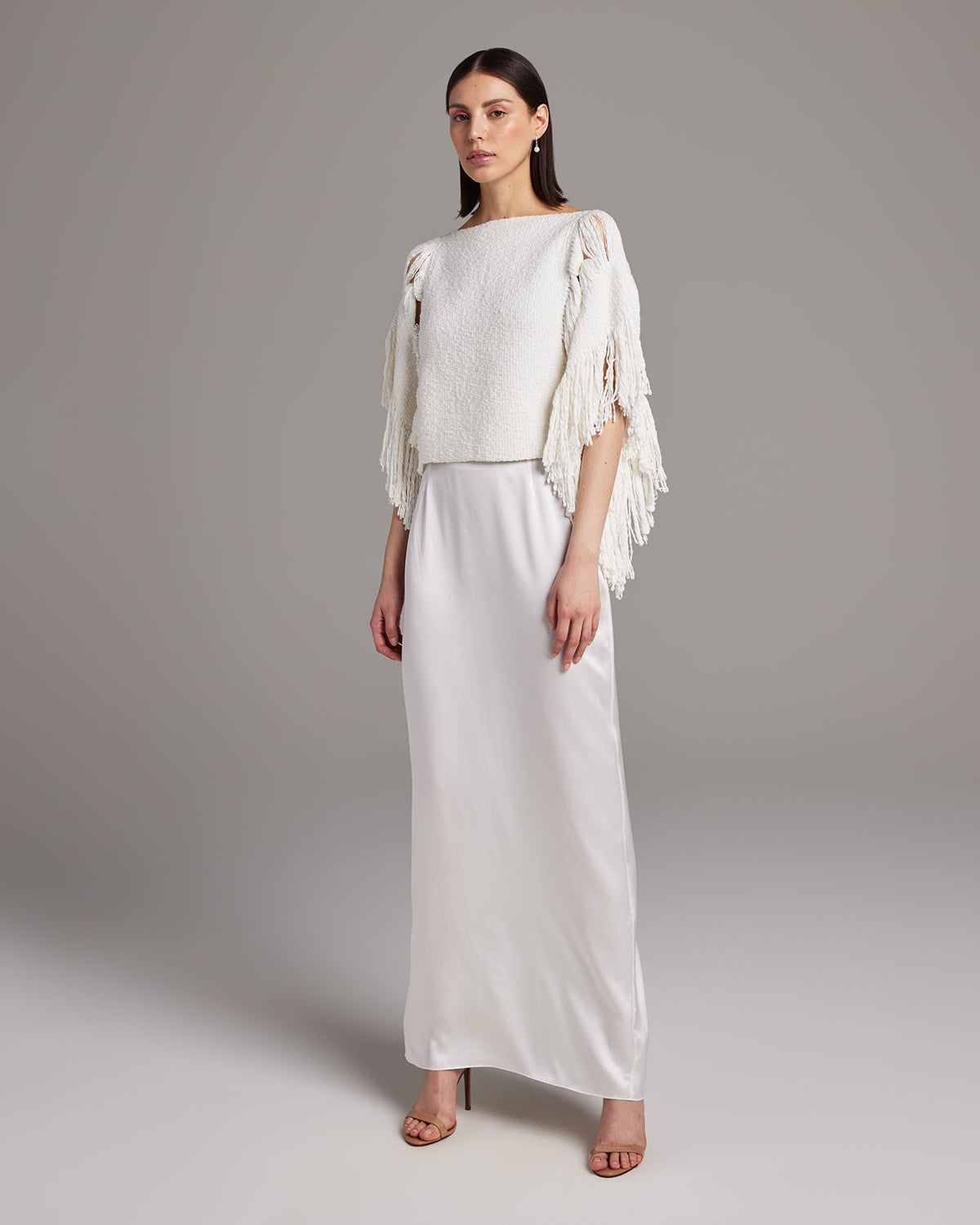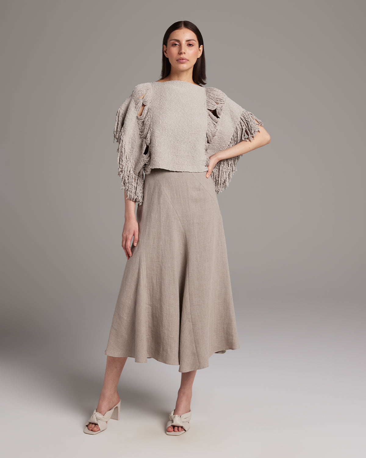 The Lace Fringe Crop Top is a simple lightweight style featuring an open weave fringe at the sleeve. The gauzy pinco cotton is perfect as a sweater over our Midi Silk Slip or with the Harlequin Linen Skirt.