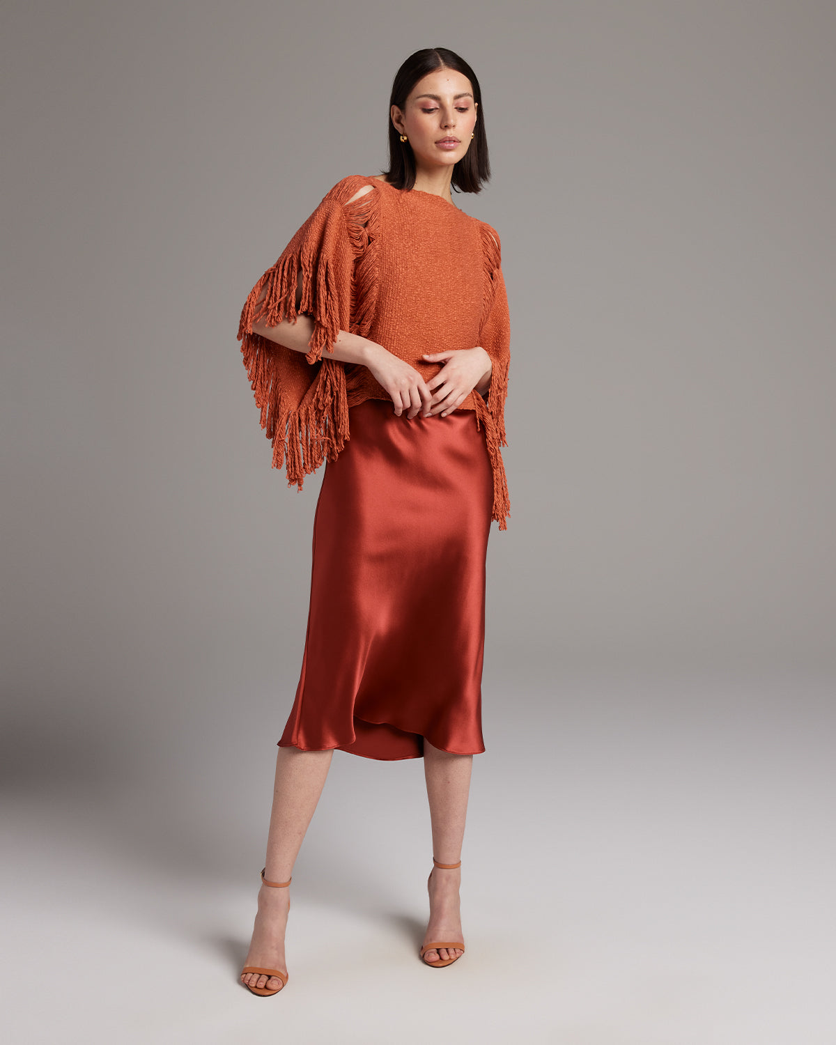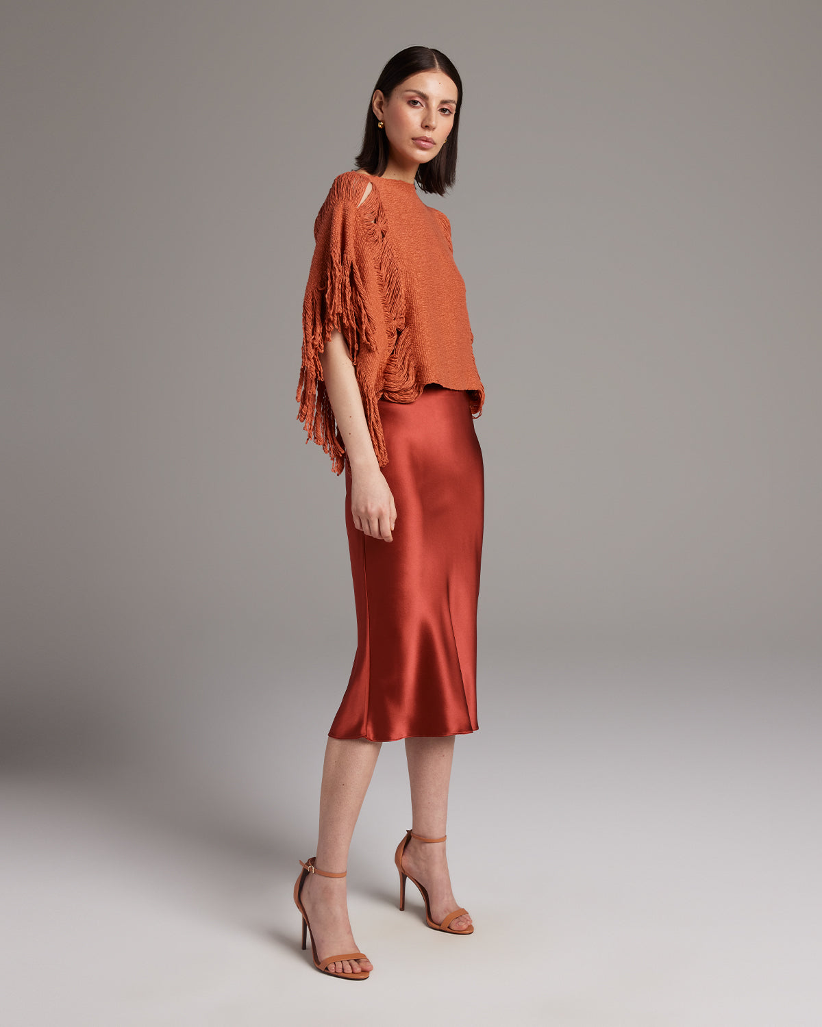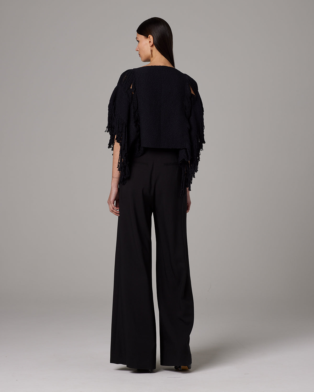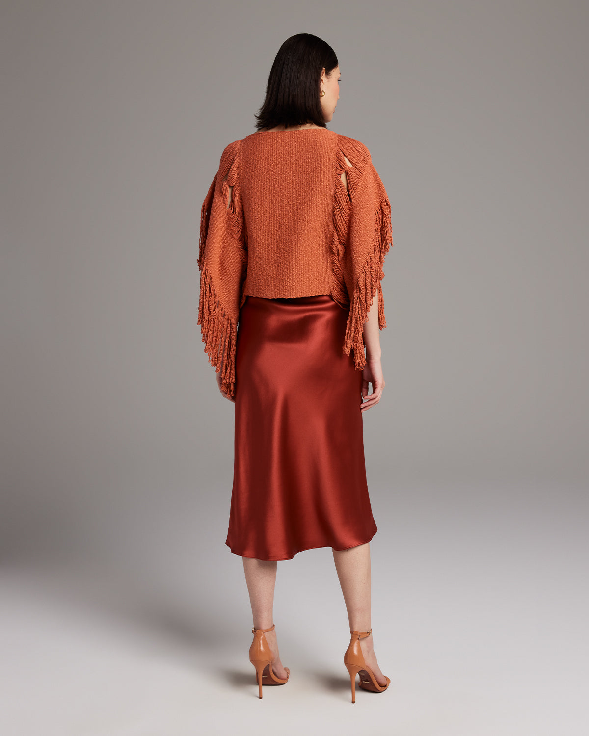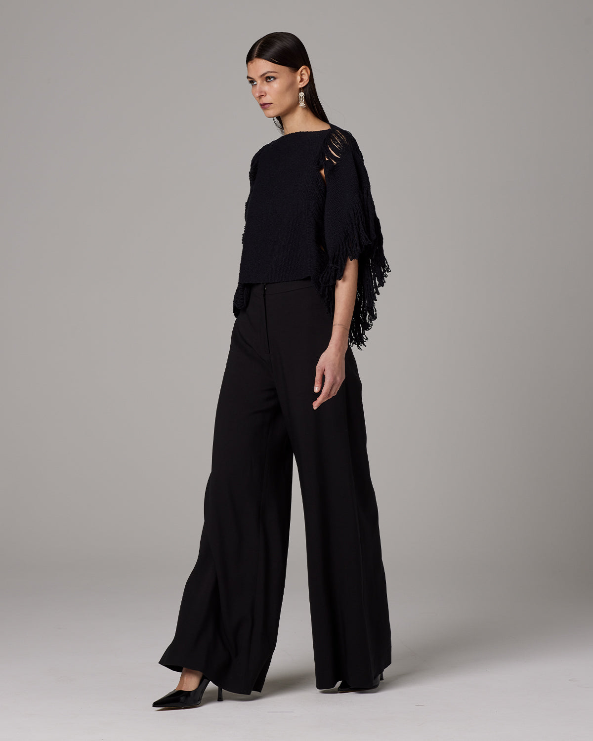 The Lace Fringe Crop Top is a simple lightweight style featuring an open weave fringe at the sleeve. The gauzy pinco cotton is perfect as a sweater over our Midi Silk Slip or with the Harlequin Linen Skirt.