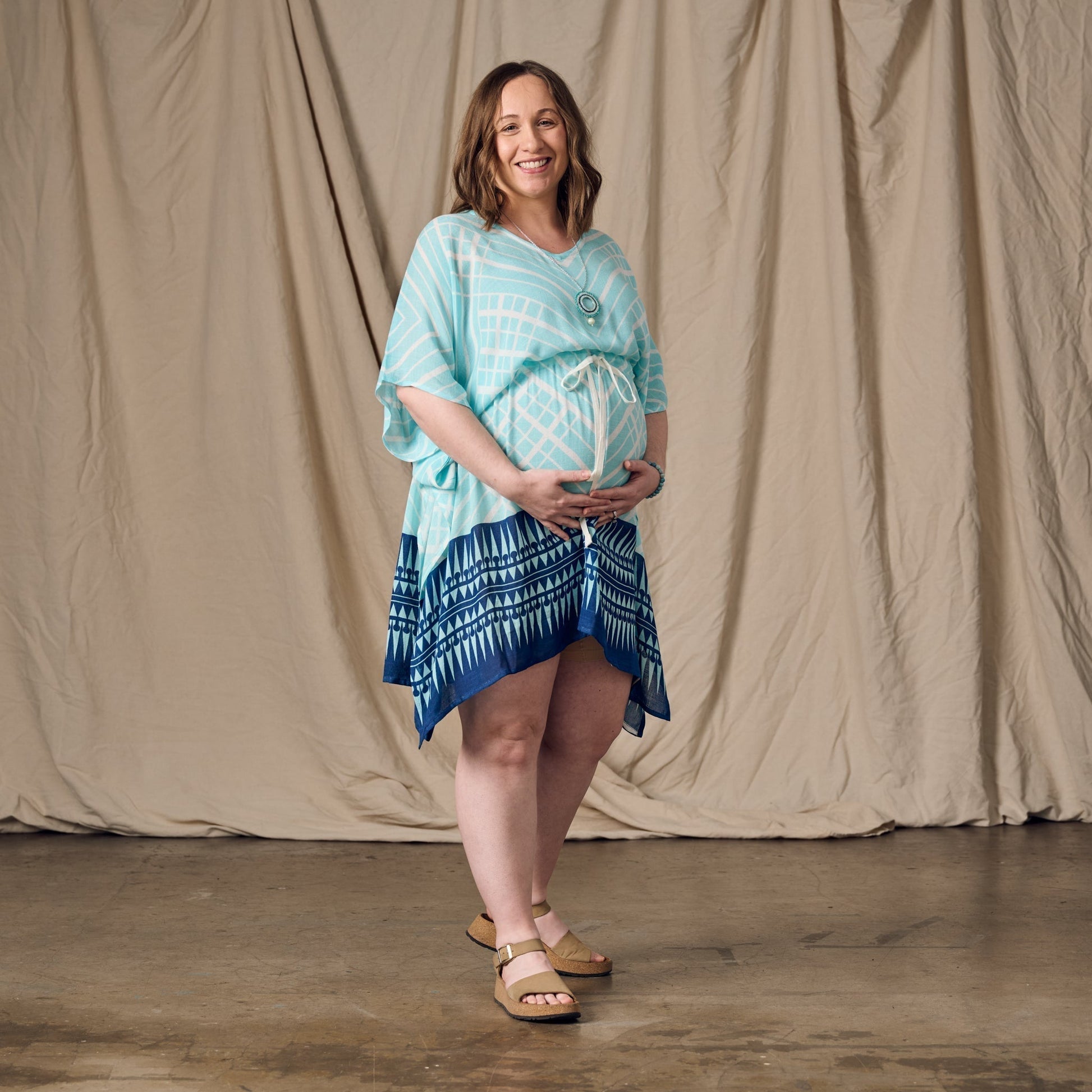 This tasteful lightweight kaftan features a vibrant turquoise and white body with a striking navy geometric border. A relaxed silhouette, open sides and adjustable drawstring waist offer effortless comfort and style. Perfect for beach days or lounging in luxury, fine details and finishing create a uniquely refined garment. A Ten Thousand Villages Exclusive handcrafted in India.