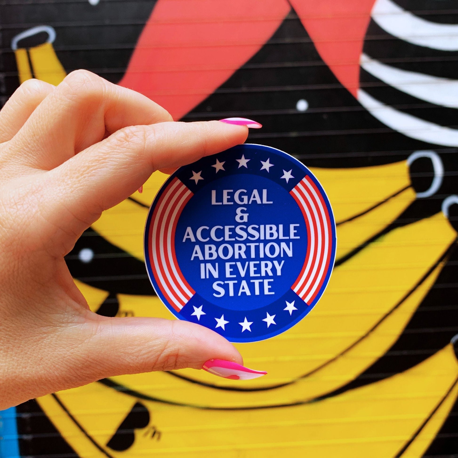 Round vinyl sticker reads: "Legal & Accessible Abortion in Every State".