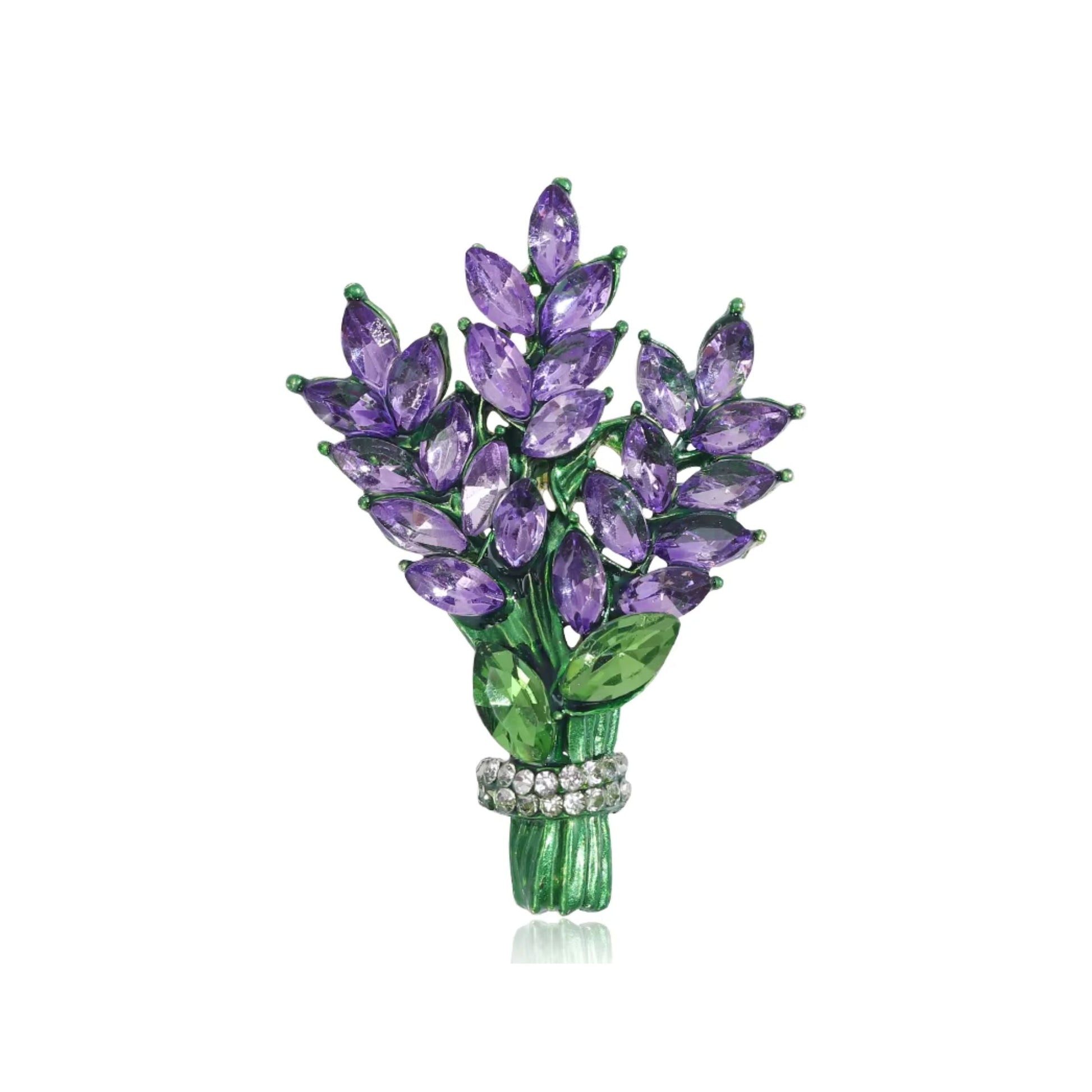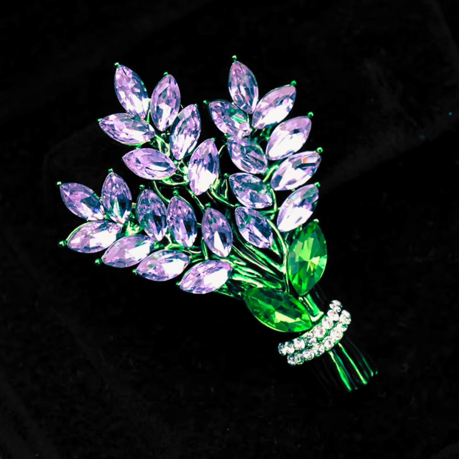 Add a touch of timeless elegance to your ensemble with this exquisite Lilac Brooch, beautifully crafted to resemble a delicate bouquet of lilac flowers. Featuring sparkling purple marquise-cut gemstones as blossoms and vibrant green crystals as leaves, this brooch radiates sophistication and charm. The stems are gracefully gathered with a glimmering band of clear rhinestones, creating a refined and polished look.