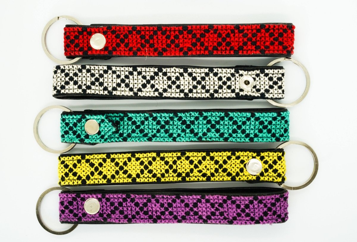 The Baker Key Fob is a chic, handmade accessory that will ensure you never lose your keys again. Find your keys within a full bag with the bright pop of color and long leather handle, or toss the key fob around your wrist for easy access. The tatreez motif stitched on this key fob is called “The Baker’s Wife.” Each of our products takes numerous hours to create through handmade leather crafting and embroidery. Our workers are skilled women artisans from the West Bank who receive training in these crafting methods to create the best quality product possible. Shop with us and contribute to these enriching training programs for more women today. Product Details: Key Fob measures 5” long Locally sourced leather from Al-Khalil (Hebron)
