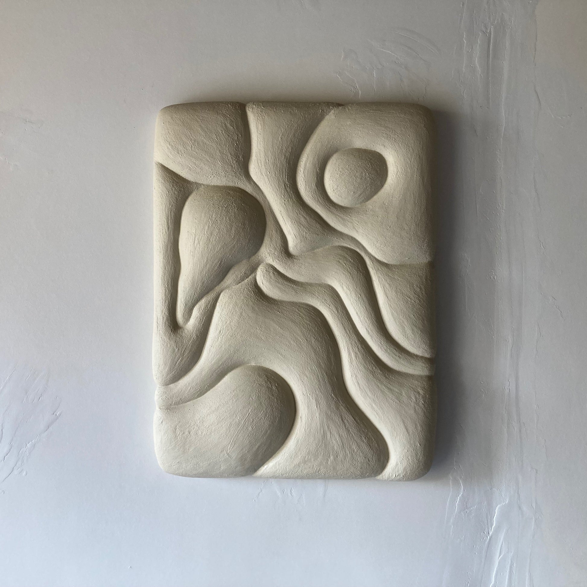 ‘Linger’ By Greyya Jay The lingering sunlight paints quiet shadows on this dimensional artwork. Relief wall art piece, hand sculpted in my Minneapolis studio. Textured, relaxed dimensional shapes. Due to the hand-sculpted nature, these can vary slightly. Creamy beige color. Simply message me for a different color or size. 19 inches wide, 25 inches tall. Depth ranges from 1-2.5 inches. Hanging hardware will be attached to the back.