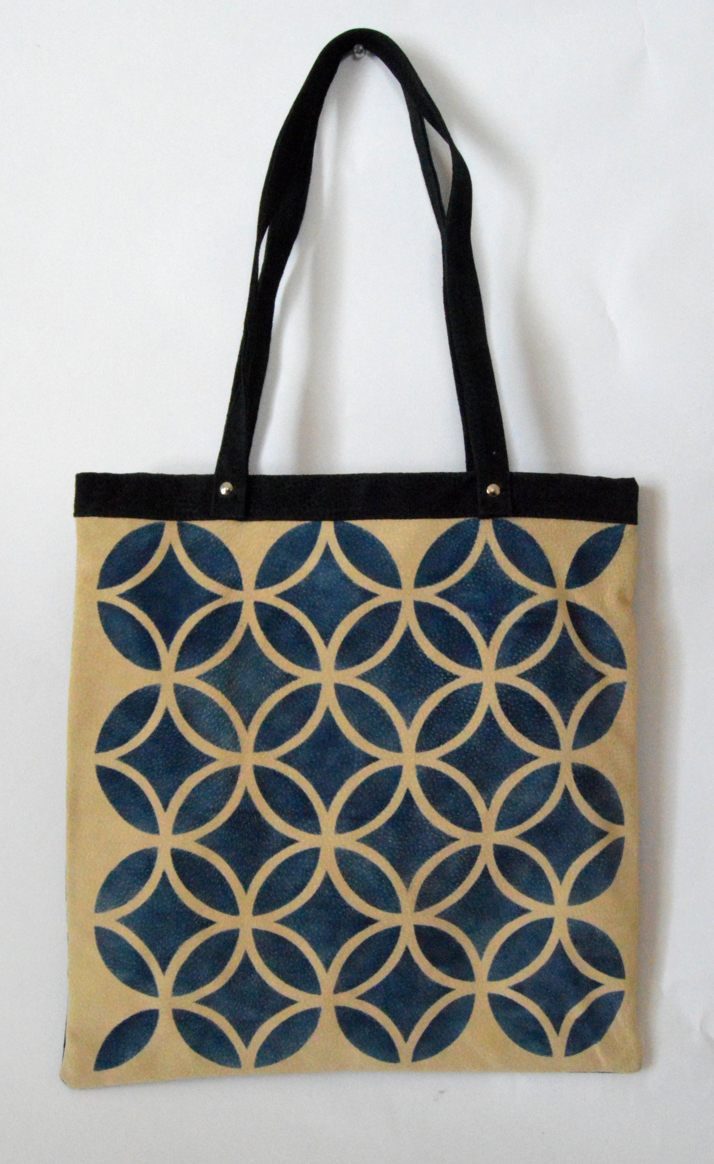 Suede, handpainted tote with simple pocket and suede handles. The Litema design of this bag is a traditional geometry from Lesotho; litema refers to the muralling women do on the outside of a home once built.