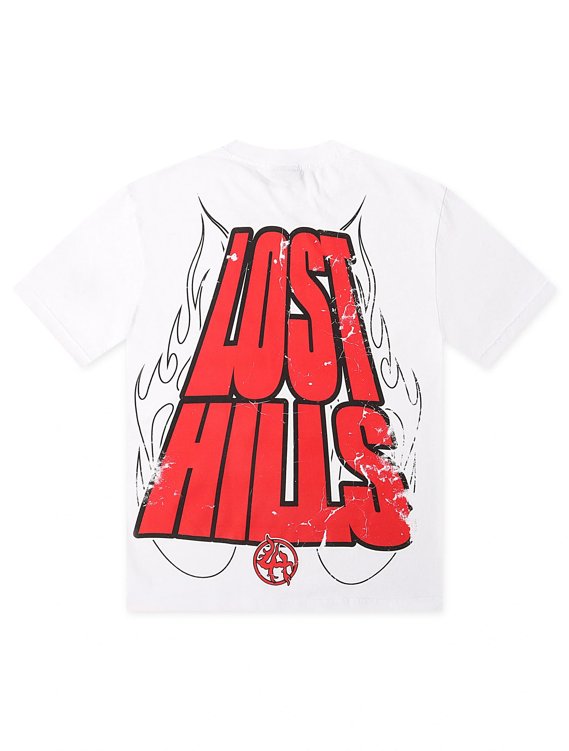 Large back print with bold LOST HILLS lettering and flame design