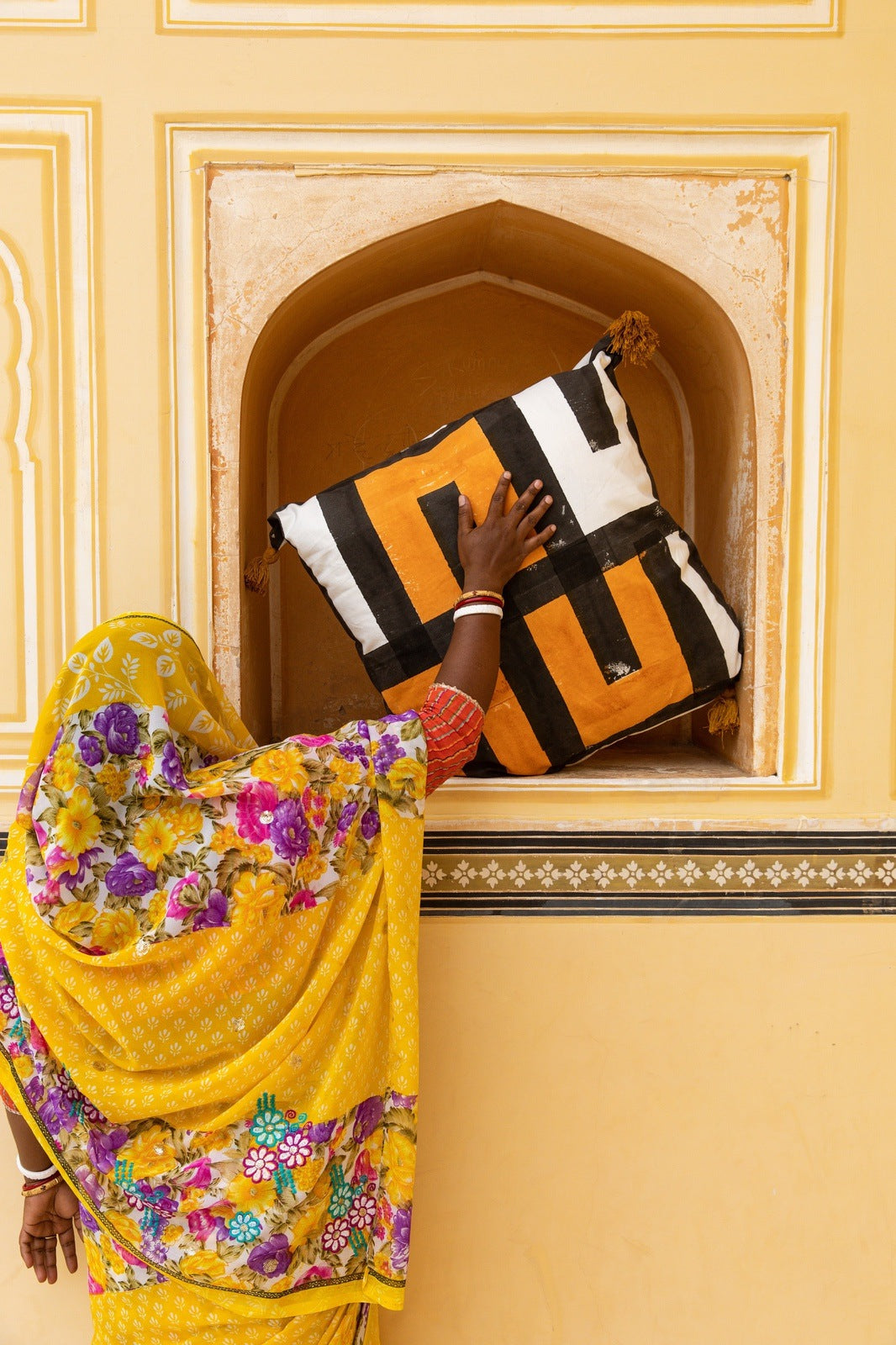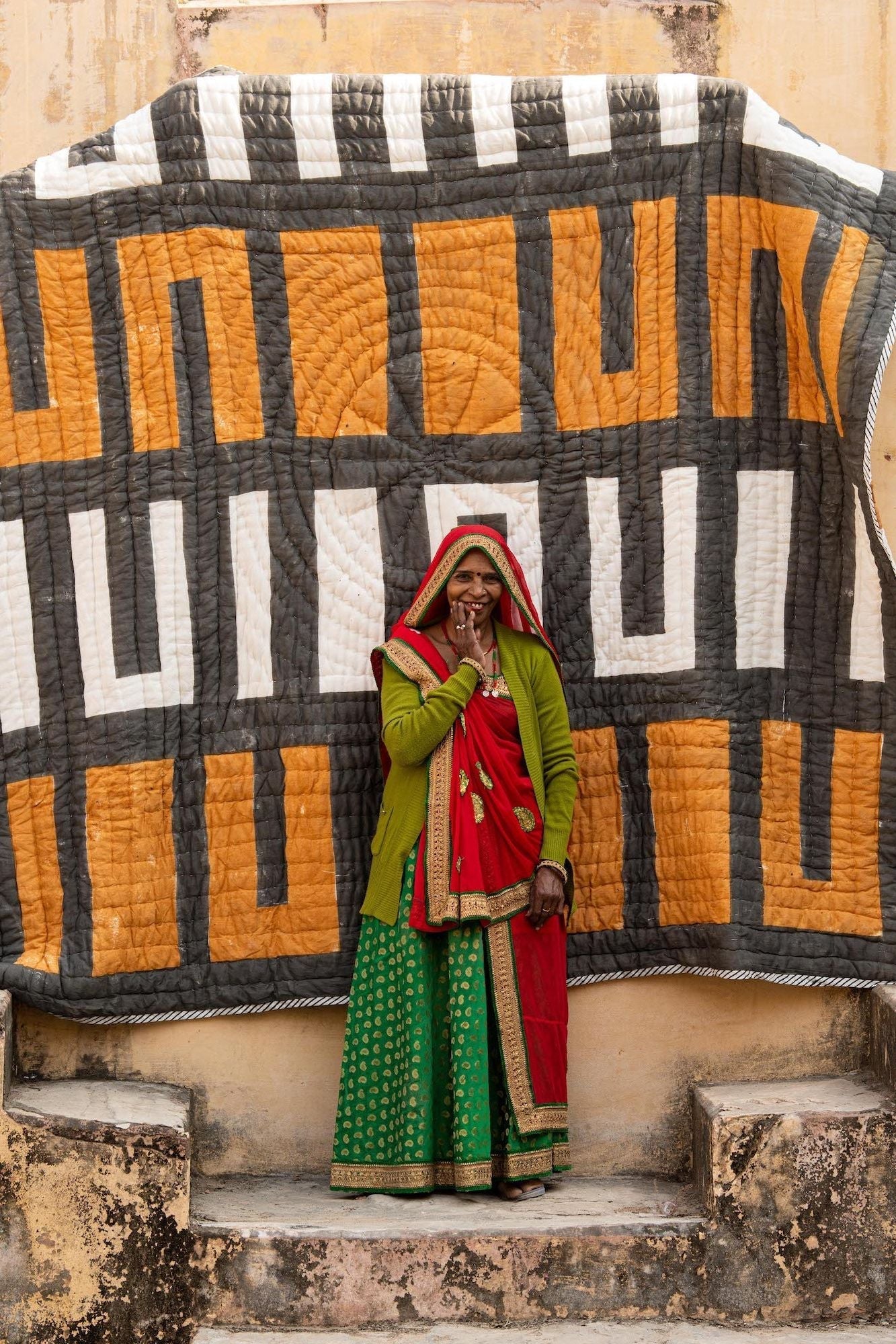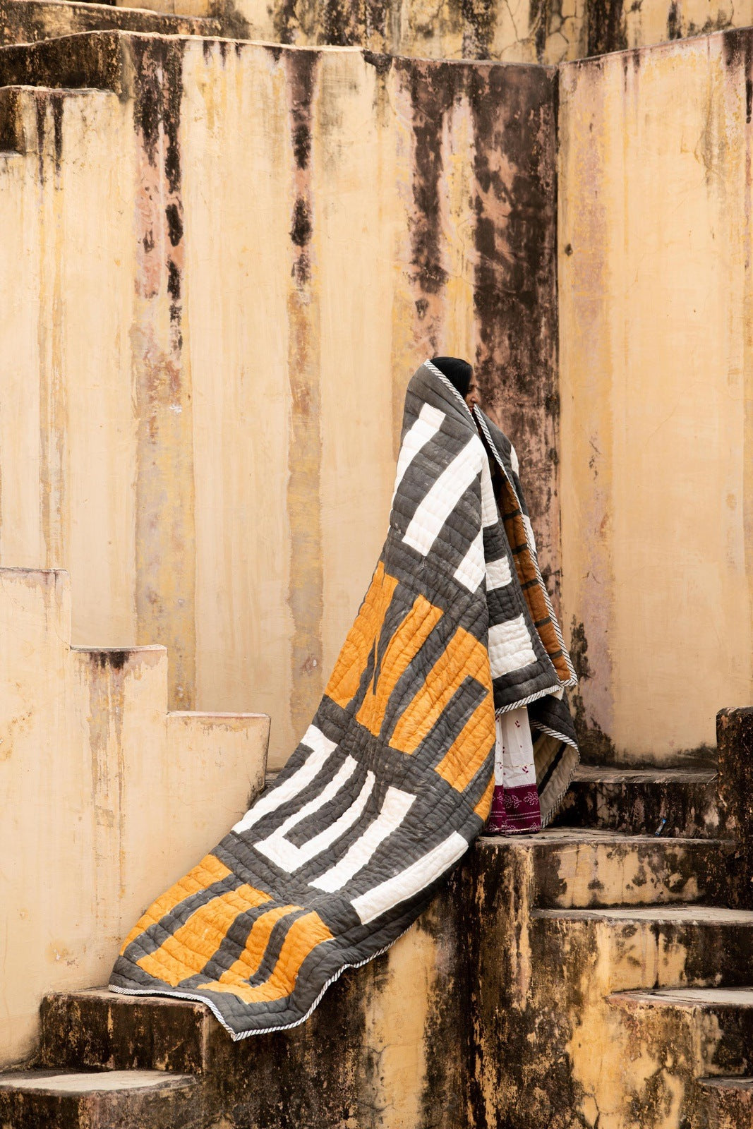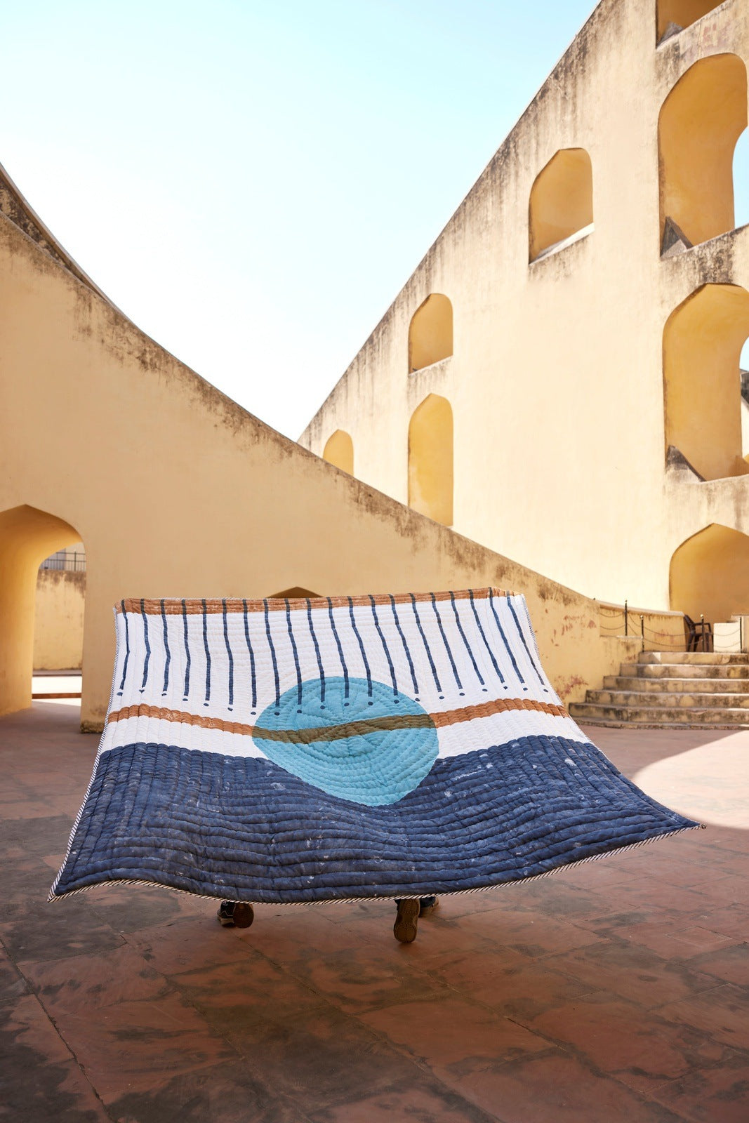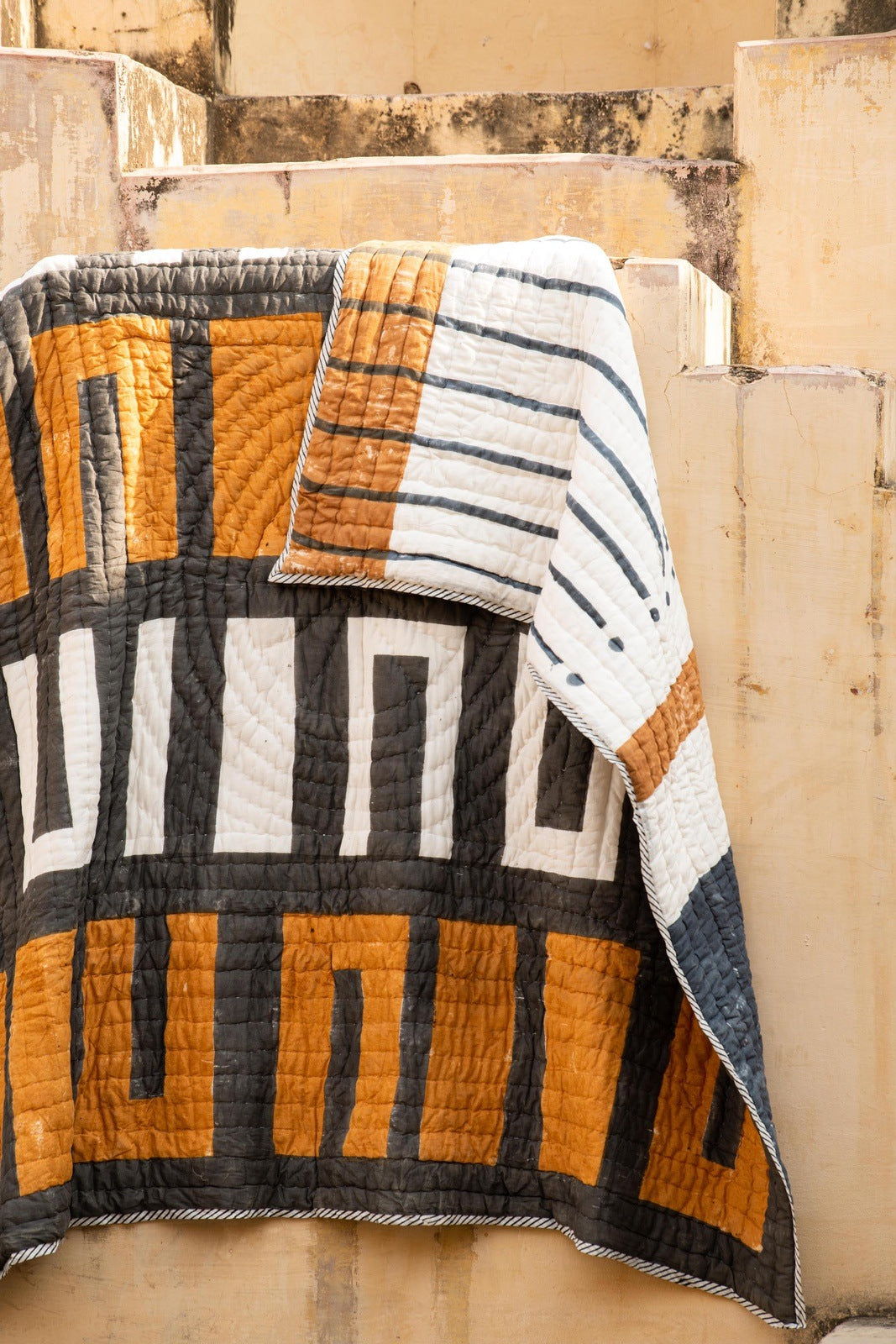The design is hand-pressed onto each quilt using hand-carved wooden blocks dipped in dyes. The printed cotton shells are brought to the homes of quiltmakers, who stuff and stitch the quilts by hand, creating the final product.