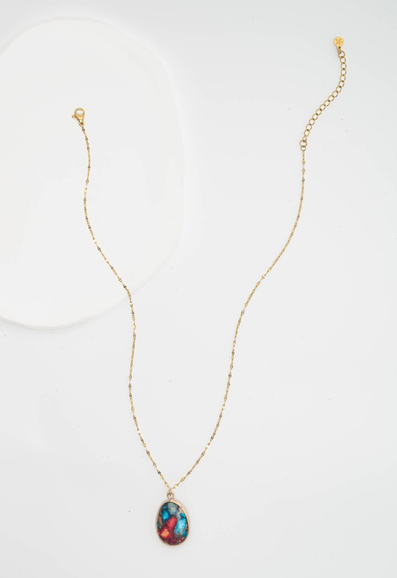 Our Mosaic Jasper Necklace features a beautiful medley of dazzling colors. Rich hues of blue and crimson flow together around accents of bronze marbling within the jasper stone framed in 14K plated gold. Wear this incredibly versatile stone dangling from an adjustable chain day to night to complete any look. As your Mosaic Necklace draws attention, take every opportunity to share the life-transforming impact of your jewelry! Box size and color may vary. Materials: 14K Gold-plated necklace with a Jasper pendant. Hypoallergenic; lead and cadmium free with nickel content less than 100 ppm. Size: 16-18 inches
