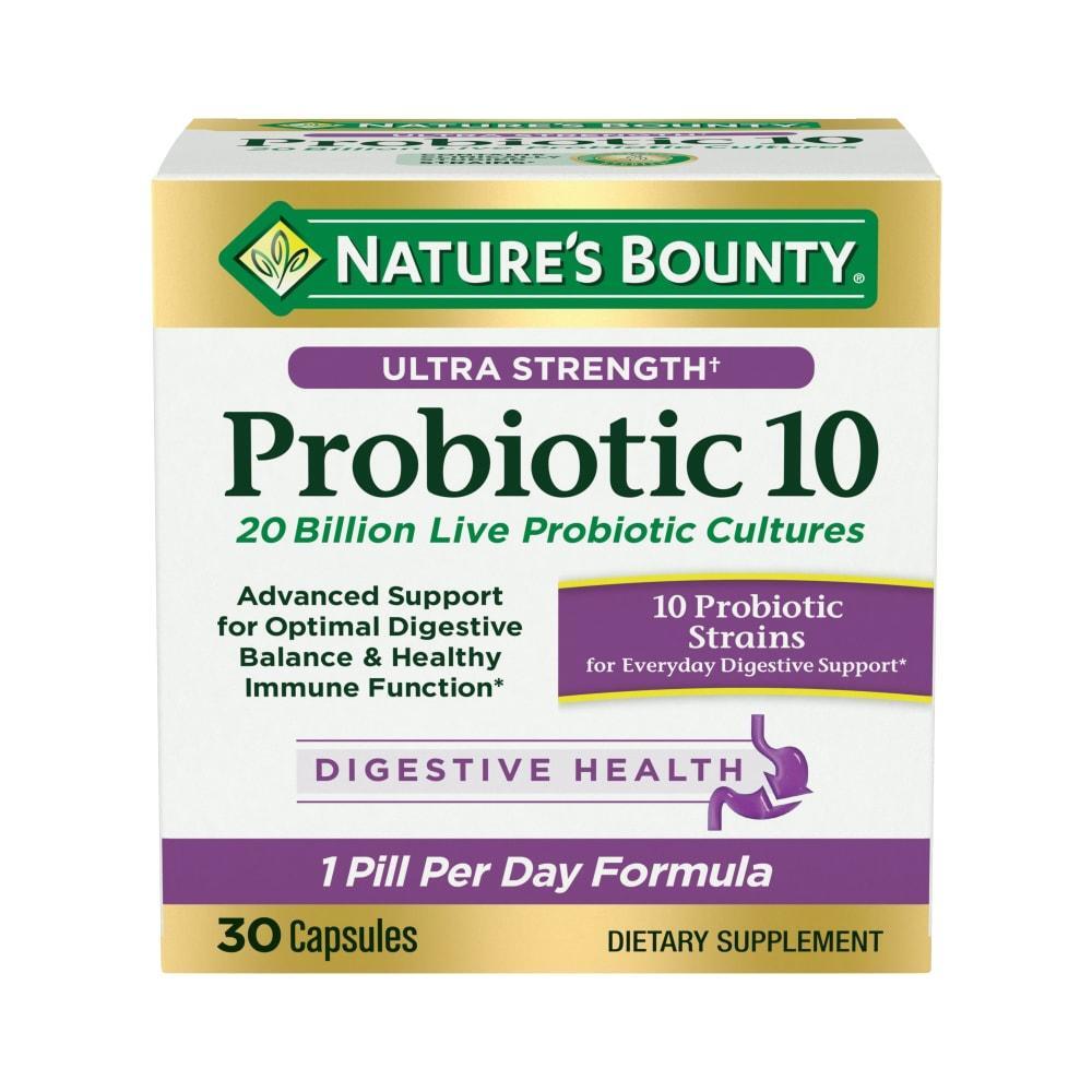 Having a healthy immune system starts with a healthy gut. Backed by 20 years of clinical research, Nature’s Bounty Ultra Strength‡ Probiotic 10 is now in a one per day formula with 20 billion live probiotic cultures. It contains 10 distinct probiotic strains to supplement the natural diversity of your digestive ecosystem. The GI microbiome is active in the digestion of food and absorption of nutrients and also supports tissues lining the immune system. The unique strains in Probiotic 10 help the body’s natural digestive process, contribute to immune health and even upper respiratory function. Nature’s Bounty Ultra Strength Probiotic 10 one-a-day probiotic for adults provides its health benefits at 20 billion CFU per day and is guaranteed through expiration. Whether you’re vegetarian or on a gluten-free diet, our probiotic is made for you. When wellness is everything, the vitamin experts at Nature’s Bounty have everything you need to get there. Prebiotic/ProbioticA product that carries an unqualified on-pack statement about the product containing prebiotic or probiotic ingredients.