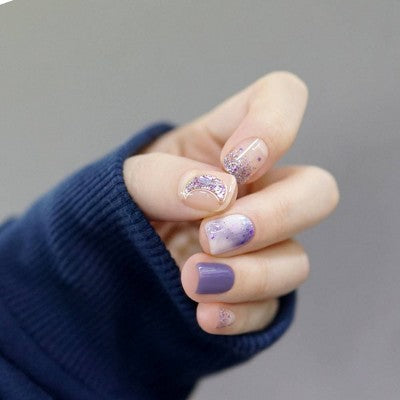 Dive into the magical allure of "N Goblin Moon" from Ohora, a semi-cured gel nail set that captivates with its bewitching purple base, mystical marbled patterns, and a charming crescent moon decal. Each set includes a variety of strip sizes for a tailored fit, ensuring up to 14 days of enchanting wear. It's designed to bring a touch of sorcery to your fingertips, offering an easy application process for both beginners and pros.