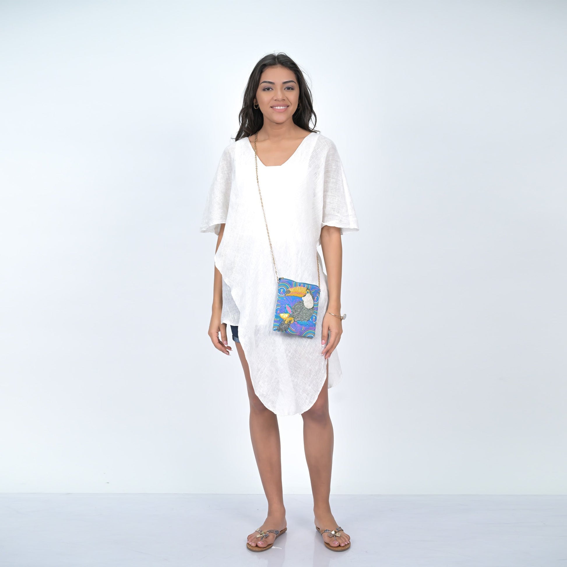 Compact and trendy to carry all your daily essentials on the go, this light weight sling bag speaks of a boho handcrafted charm. Its bright and colorful appeal can be used to dress up any outfit. This beaded bag features a gold chain strap. DETAILS Blue Sling Bag Exterior: 100% Cotton, Exclusive of Decoration Interior: 100% Viscose Golden tone Hardware Main Zipper Closure SIZE: 6" x 7" Designed in Los Angeles Made in India