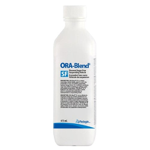 Ora-Blend SF is an aqueous-based, sweetened vehicle consisting of a synergistic blend of suspending agents that have a high degree of colloidal activity. The suspending agents form a structured, gel-like matrix which suspend particles and allow for little settling. Ora-Blend SF is buffered to a slightly acidic pH to help reduce degradation of medicinal agents through oxidation. An anti-foam agent is incorporated into Ora-Blend SF to allow for vigorous shaking with minimal foam.