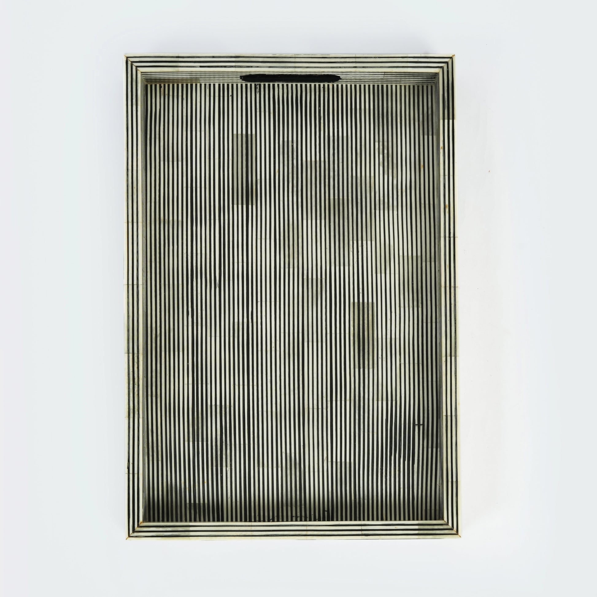 Bring a touch of modern elegance to your home with this handcrafted rectangular tray, featuring a bold grey and black pinstripe design in bone and resin inlay over a durable base. Generously sized at 18" x 14" x 2", it’s perfect for serving drinks and snacks or as a decorative base for candles, books, or barware. Whether placed on a coffee table, vanity, or console, this tray blends functionality with artisan beauty. Pair it with matching pieces from the Pinstripe collection—like coasters, photo frames, and boxes—for a cohesive, refined look.