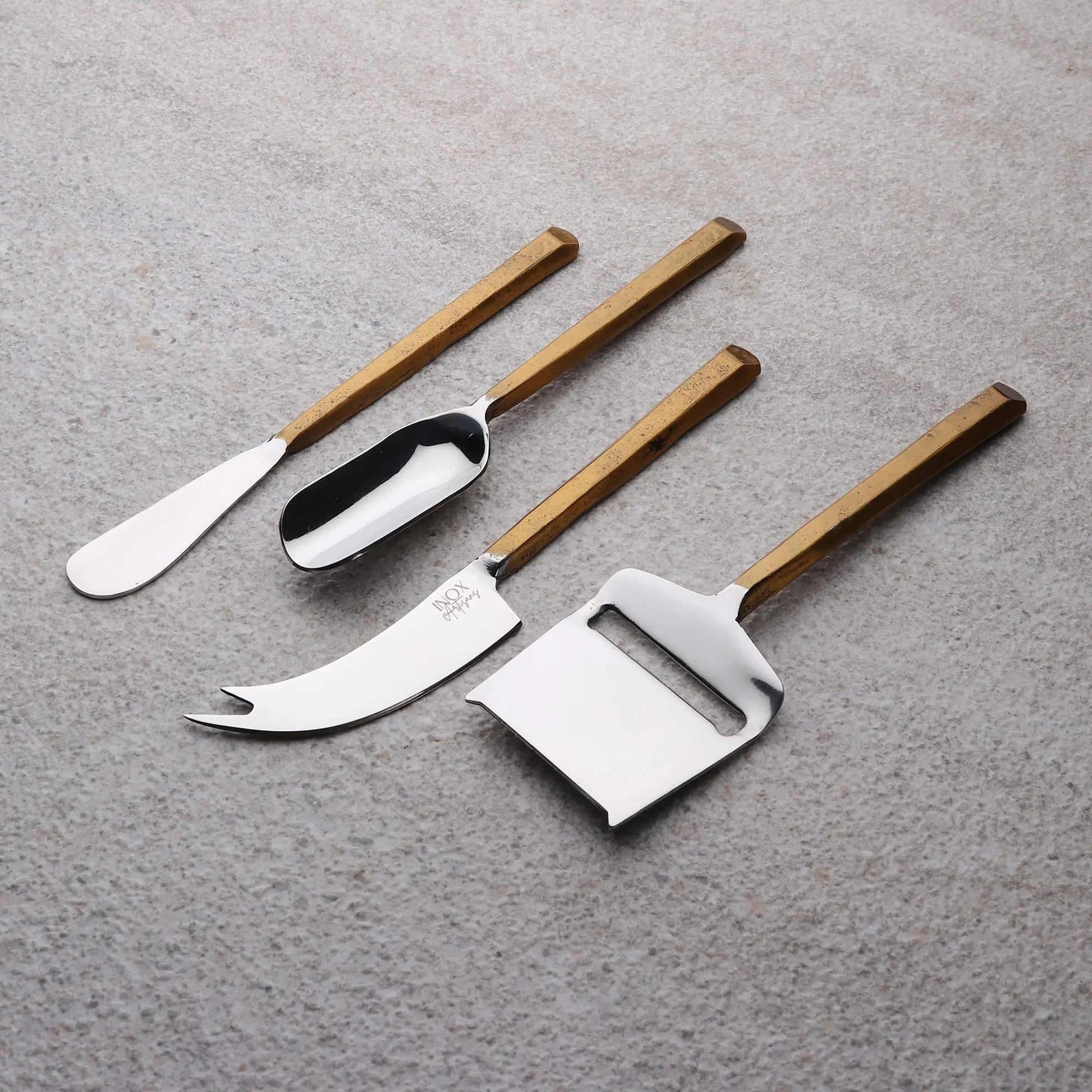 Add style to any occasion with the hand-forged Plateau Cheese Tools 4-Pc Set. Each set of four cheese knives includes a pronged cheese knife, cheese/butter spreader, Stilton scoop (ideal for crumbly Blue cheese), and a cheese planer/shaver knife. Finished in vintage gold, this cheese knife set is a lovely addition to your cheese and charcuterie boards.