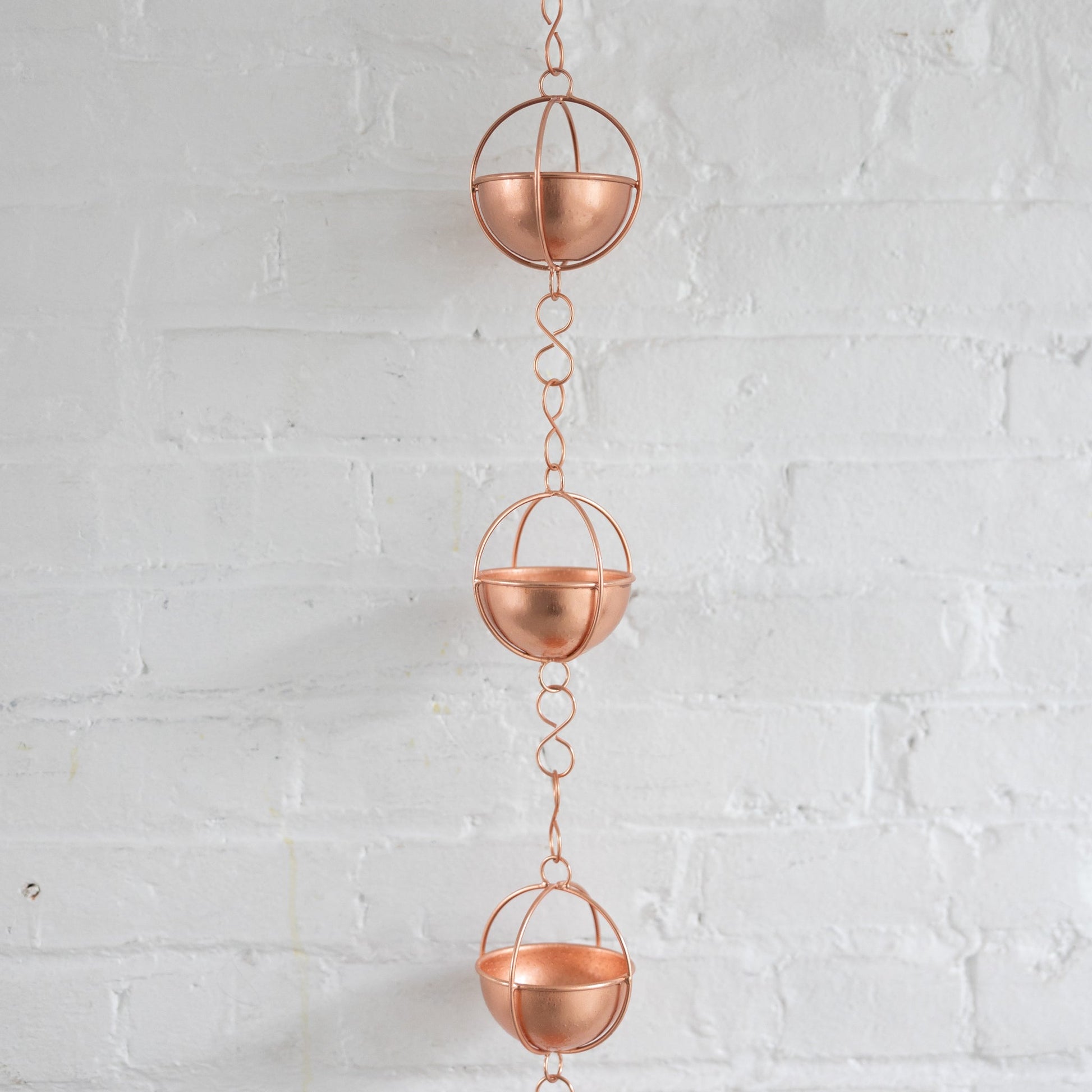 Introducing the Prava Copper Rain Chain! Say goodbye to boring rain spouts. Eleven round cups, each surrounded by intersecting circles, make rainwater flow in a unique and beautiful way. Attach easily to your rain spout for a fun twist on traditional downspouts. Enjoy the calming sound and fascinating sight of rain cascading from your gutter to your garden.